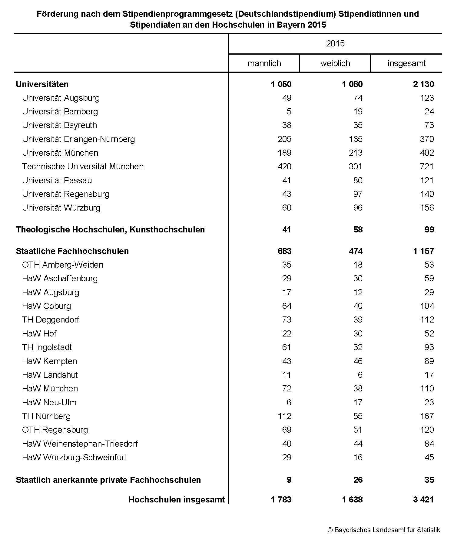 Mehr als zwei Drittel (69,4 Prozent) der teilnahmeberechtigten Hochschulen in Bayern beteiligten sich 2015 am Deutschlandstipendium. Damit hatten 2015 93,0 % aller Studierenden in Bayern die Möglichkeit, sich um die einkommensunabhängige Förderung zu bewerben.
