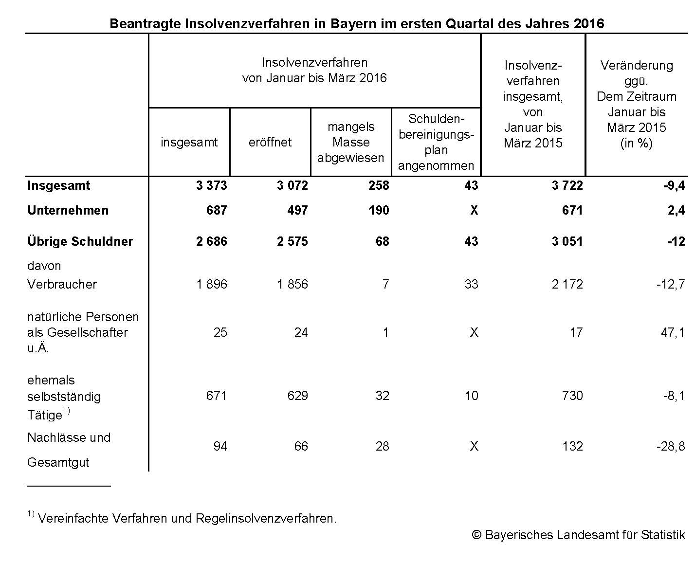 Nach Mitteilung des Bayerischen Landesamts für Statistik wurden im ersten Quartal des Jahres 2016 bei den bayerischen Insolvenzgerichten insgesamt 3 373 Insolvenzverfahren beantragt, darunter 687 Unternehmens- und 1 896 Verbraucherinsolvenzverfahren. Verglichen mit dem ersten Quartal im Jahr 2015 stieg die Anzahl der beantragten Unternehmensinsolvenzverfahren damit um 2,4 Prozent an, während die der beantragten Verbraucherinsolvenzverfahren hingegen um 12,7 Prozent zurückging. Über zwei Drittel (72,3 Prozent bzw. 497 Fälle) der beantragten Unternehmensinsolvenzverfahren wurden eröffnet, während 27,7 Prozent mangels Masse abgewiesen werden mussten. Die Anzahl der eröffneten Unternehmensinsolvenzverfahren erhöhte sich damit um 8,5 Prozent gegenüber dem gleichen Zeitraum im Jahr 2015. Auf eine beantragte Unternehmensinsolvenz entfielen im Mittel voraussichtliche Gläubigerforderungen in Höhe von 454 175 Euro, was knapp zwei Dritteln (71,2 Prozent) des Wertes im ersten Quartal im Jahr 2015 entspricht (637 477 Euro). Bei den Ver-braucherinsolvenzverfahren lag die durchschnittliche Forderungssumme für ein beantragtes Verfahren im Berichtszeitraum bei 53 851 Euro, während sie im ersten Quartal des Vorjahres 56 229 Euro betragen hatte.