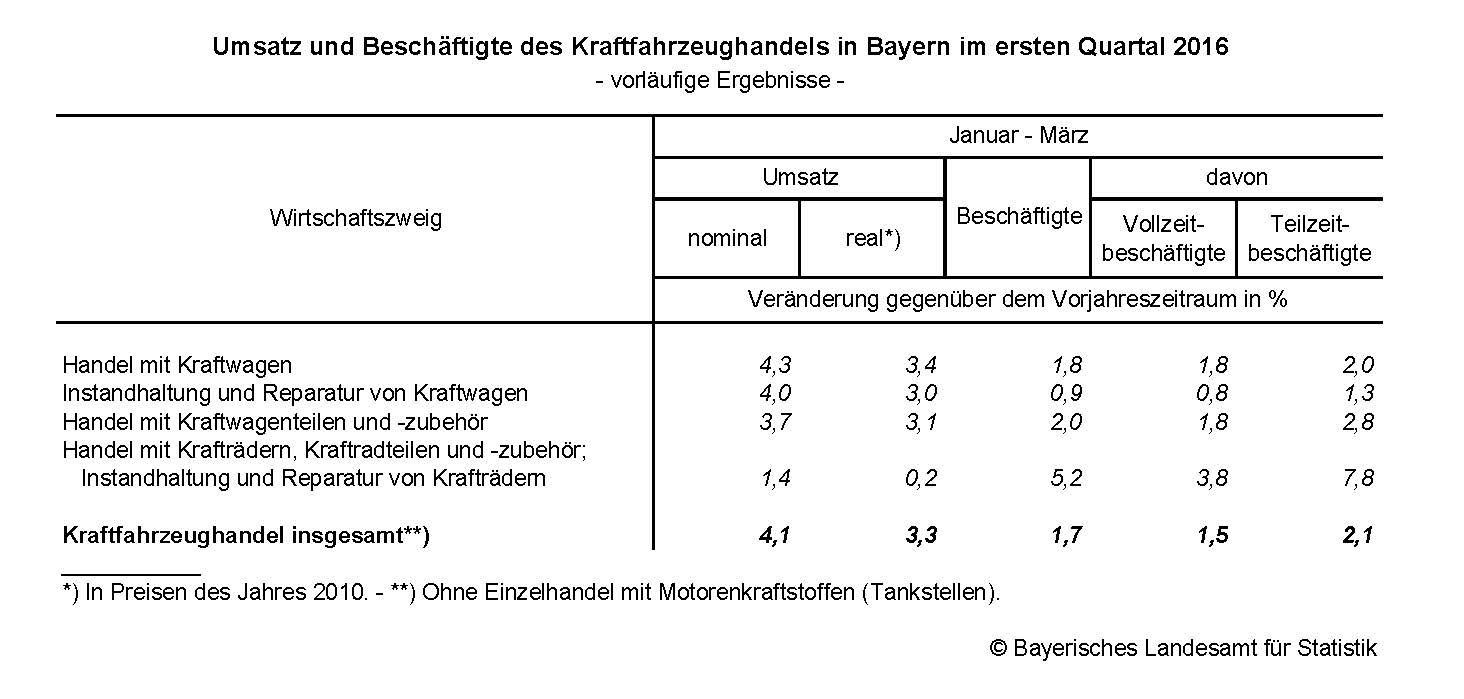 Der Umsatz des bayerischen Kraftfahrzeughandels erhöhte sich nach vorläufigen Ergebnissen des Bayerischen Landesamts für Statistik in den ersten drei Monaten 2016 im Vergleich zum Vorjahreszeitraum nominal um 4,1 Prozent und real um 3,3 Prozent. Die Zahl der Beschäftigten nahm um 1,7 Prozent zu.