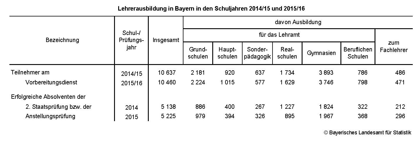 In der Aufstellung nicht enthalten sind die Förderlehrer, die zur Unterstützung des Unterrichts an Grund- und Hauptschulen eingesetzt werden. Von diesen befanden sich im Jahr 2015 in Bayern 235 in Ausbildung und 67 bestanden erfolgreich ihre 1. Lehramtsprüfung, an die sich dann der Vorbereitungsdienst anschließt.