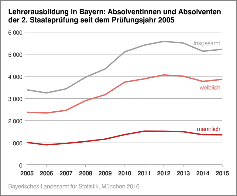 Die Ausbildung von Lehrern umfasst die Ausbildung für das Lehramt an allgemeinbildenden und beruflichen Schulen in Bayern und die Ausbildung zum Fach- oder Förderlehrer. Wie das Bayerische Landesamt für Statistik mitteilt, bestanden im Jahr 2015 insgesamt 5 225 angehende Lehrerinnen und Lehrer die Zweite Staatsprüfung bzw. Anstellungsprüfung im Anschluss an ihren Vorbereitungsdienst und qualifizierten sich damit für die Übernahme in den Schuldienst. Im Vergleich zum Vorjahr bedeutet dies einen Zuwachs um 87 Absolventen. Mit 37,6 Prozent strebten die meisten Nachwuchslehrkräfte eine berufliche Laufbahn als Lehrkraft an Gymnasien an. Fast Dreiviertel der Lehramtsabsolventen in Bayern sind Frauen. Die Zahl der noch in Ausbildung befindlichen Lehramtsanwärterinnen und -anwärter ist gegenüber dem Vorjahr leicht rückläufig. Im Schuljahr 2015/16 befanden sich insgesamt 10 460 Teilnehmer im Vorbereitungsdienst (2014/15: 10 637).