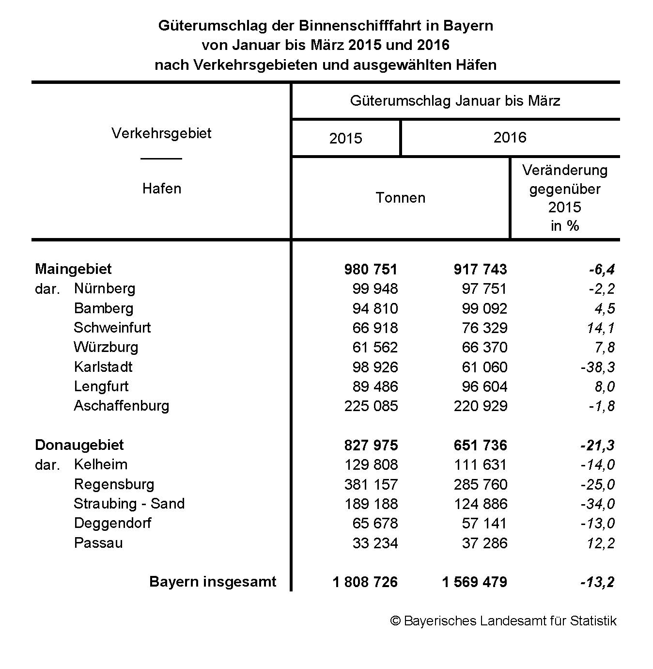 Der Güterumschlag an der Donau ging im ersten Quartal 2016 um 21,3 Prozent auf 0,65 Millionen Tonnen zurück, in den Mainhäfen sank er um 6,4 Prozent. Die umschlagstärksten Häfen waren Regensburg mit 0,29 Millionen und Aschaffenburg mit 0,22 Millionen Tonnen.