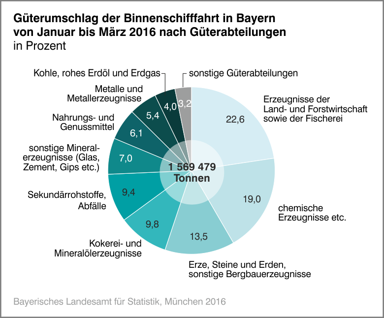 Wie das Bayerische Landesamt für Statistik mitteilt, lag der Güterumschlag der bayerischen Binnenschifffahrt im ersten Quartal 2016 bei 1,57 Millionen Tonnen und damit 13,2 Prozent unter dem Stand des Vorjahres. Im Maingebiet wurden 0,92 Millionen Tonnen verladen (-6,4 Prozent) und im Donaugebiet 0,65 Millionen Tonnen (-21,3 Prozent). Die umschlagstärksten Häfen an der Donau waren Regensburg und Straubing-Sand, am Main waren es Aschaffenburg und Bamberg. Es wurden hauptsächlich land- und forstwirtschaftliche Erzeugnisse sowie chemische Erzeugnisse zu Wasser transportiert.