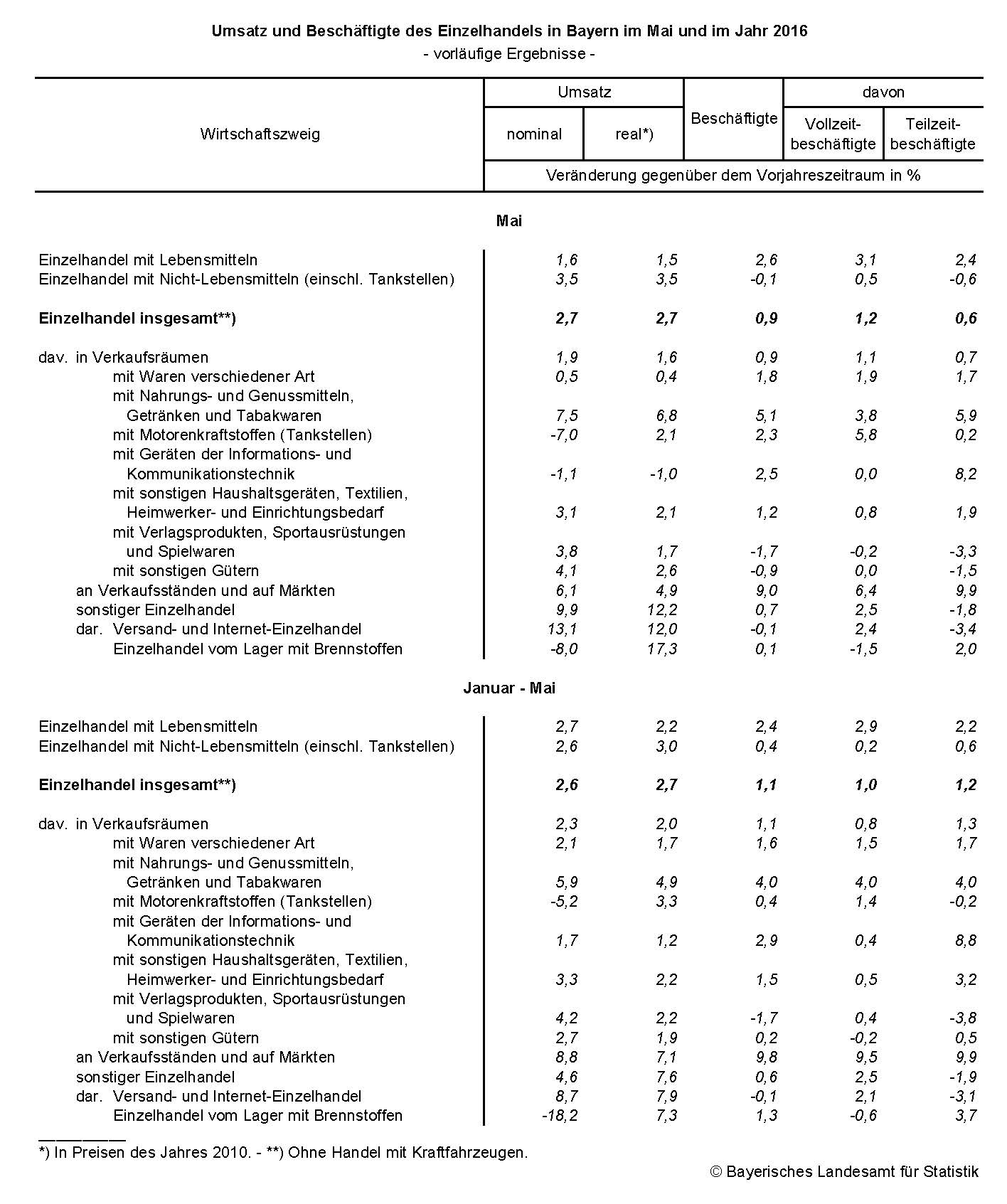 In den ersten fünf Monaten 2016 nahm der Umsatz des bayerischen Einzelhandels gegenüber dem Vorjahreszeitraum nominal um 2,6 Prozent und real um 2,7 Prozent zu. Die Zahl der Beschäftigten erhöhte sich um 1,1 Prozent.