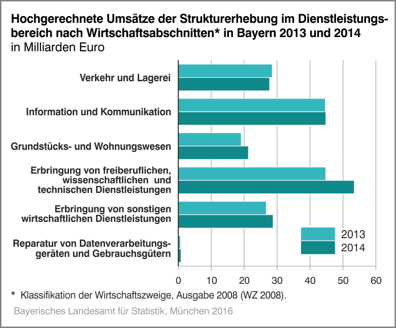 Das Bayerische Landesamt für Statistik ermittelte im Rahmen der jährlichen Strukturerhebung im Dienstleistungsbereich die Erhebungsdaten des Jahres 2014 unter anderem für den Wirtschaftsabschnitt „Erbringung von freiberuflichen, wissenschaftlichen und technischen Dienstleistungen“. Im Berichtsjahr waren hier hochgerechnet rund 83 000 bayerische Unternehmen tätig. Der Gesamtumsatz des Wirtschaftsabschnittes belief sich im Jahr 2014 auf 53,4 Milliarden Euro. Im Vergleich mit den anderen, im Rahmen der Strukturerhebung im Dienstleistungsbereich erhobenen Wirtschaftsabschnitten, wurde im Bereich „Erbringung von freiberuflichen, wissenschaftlichen und technischen Dienstleistungen“ der höchste Gesamtumsatz erzielt.