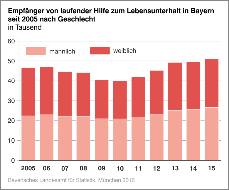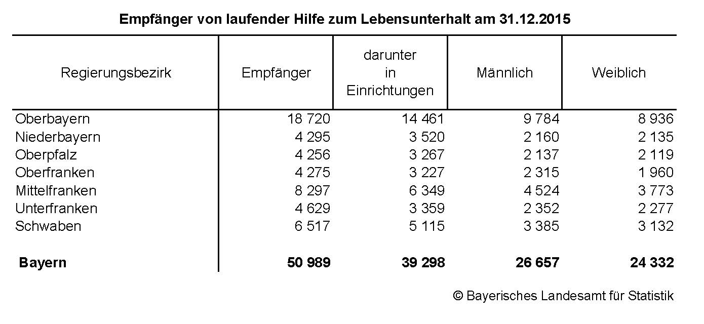 Zum Jahresende 2015 waren in Bayern insgesamt 50 989 Menschen auf Leistungen im Rahmen der Hilfe zum Lebensunterhalt angewiesen. Das entspricht nach Angaben des Bayerischen Landesamts für Statistik einem Plus von rund drei Prozent gegenüber dem Vorjahr (49 509 Empfänger). Hilfebedürftig waren 26 657 Männer und 24 332 Frauen, die Mehrzahl der Hilfeempfänger (39 298) lebte in einer Einrichtung wie einem Wohn- oder Pflegeheim.