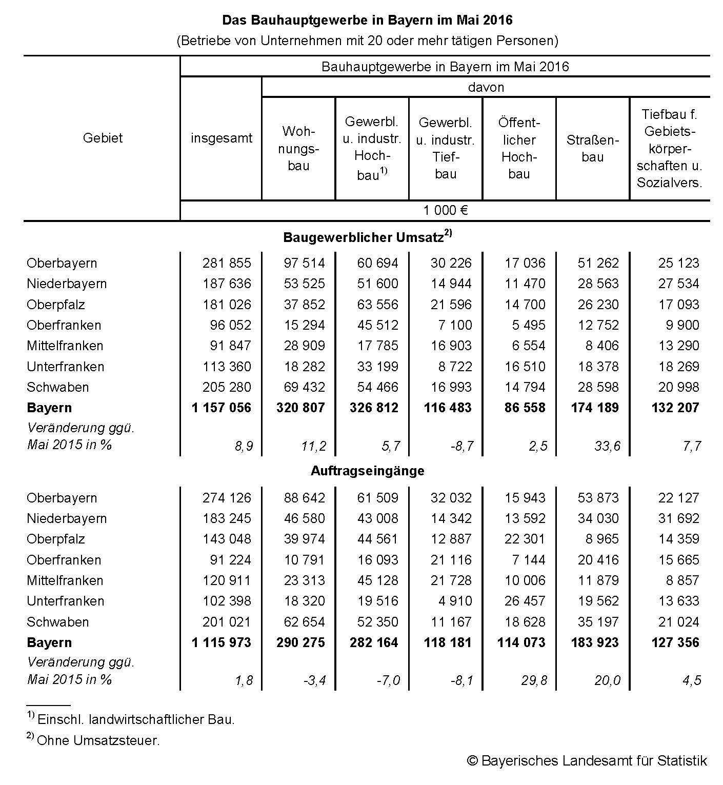 Das bayerische Bauhauptgewerbe erzielte im Mai 2016 einen baugewerblichen Umsatz von insgesamt 1,16 Milliarden Euro und damit ein Umsatzplus von 8,9 Prozent im Vergleich zum entsprechenden Vorjahresergebnis. Nach Angaben des Bayerischen Landesamts für Statistik haben zu dieser positiven Gesamtent-wicklung alle sieben Regierungsbezirke Bayerns beigetragen, darunter am stärksten der Regierungsbezirk Niederbayern (+16,3 Prozent gegenüber Mai 2015 auf aktuell 187,6 Millionen Euro baugewerblicher Umsatz). Den gewerblichen und industriellen Tiefbau ausgenommen (-8,7 Prozent), punktete der baugewerbliche Umsatz des Wirtschaftssektors auch nach Bausparten unterschieden durchweg positiv, und zwar mit Zuwachsraten zwischen 2,5 Prozent (öffentlicher Hochbau) und 33,6 Prozent (Straßenbau). Ende Mai 2016 waren im bayerischen Bauhauptgewerbe insgesamt 83 558 Personen tätig (+3,5 Prozent) und die Auftragseingänge bezifferten sich auf einen Gesamtwert von 1,12 Milliarden Euro (+1,8 Prozent).