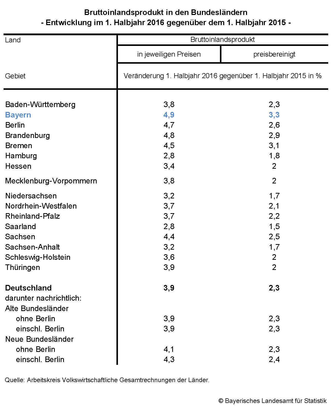 Nach Mitteilung des Bayerischen Landesamts für Statistik nahm das Bruttoinlandsprodukt in Bayern im ersten Halbjahr 2016 gegenüber dem ersten Halbjahr 2015 nach ersten Berechnungen preisbereinigt um 3,3 Prozent zu. Damit fiel das bayerische Wirtschaftswachstum in den ersten sechs Monaten des laufenden Jahres überdurchschnittlich hoch aus. In Deutschland insgesamt lag es bei 2,3 Prozent.