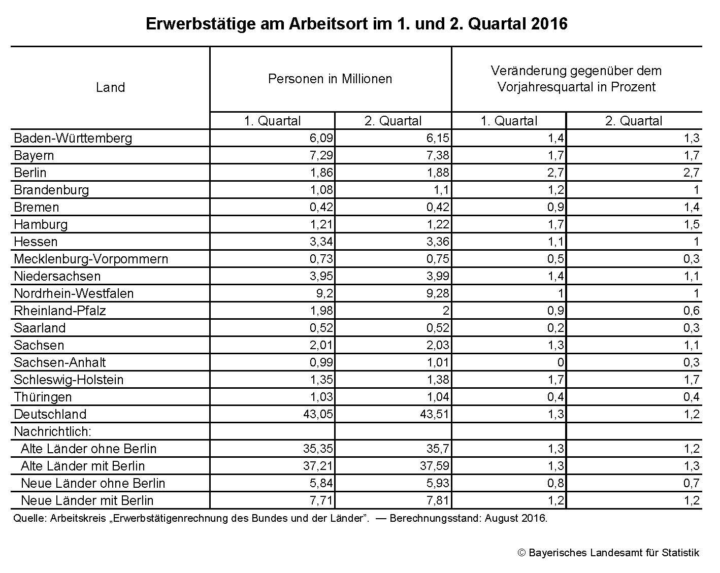 Im 2. Quartal 2016 waren nach Angaben des Bayerischen Landesamts für Statistik in Bayern 7,38 Millionen Erwerbstätige beschäftigt. Dies bedeutete gegenüber dem 2. Quartal 2015 eine Zunahme um mehr als 124 000 Personen bzw. 1,7 Prozent. Damit wuchs die Beschäftigung in Bayern im Vergleich zu den anderen Bundesländern überdurchschnittlich an.