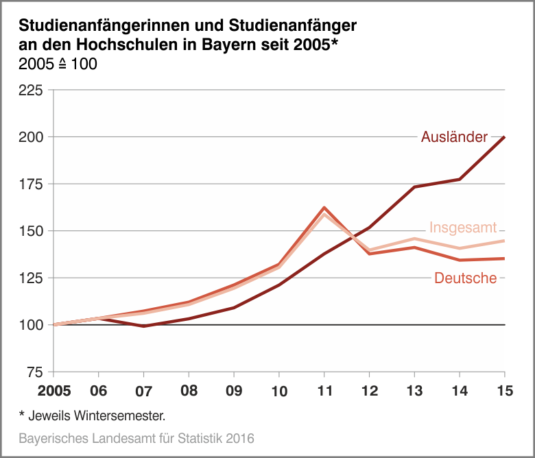 2015 um 0,1 Prozent unter dem Vorjahresniveau lag, stieg die Zahl der Ausländer, die in Bayern ein Studium aufnahmen um 12,6 Prozent auf 17 756 an. Damit hatte über ein Fünftel der Studienanfänger/-innen (23,9 Prozent) eine ausländische Staatsangehörigkeit. Rund 70,9 Prozent dieser Erstimmatrikulierten nahmen ein Universitätsstudium auf.