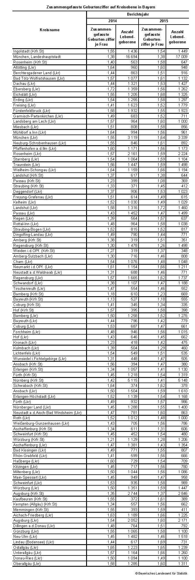 Auf Kreisebene weist der Landkreis Landshut mit 1,72 Kindern je Frau (2014: 1,58), den höchsten Wert für das Jahr 2015 in Bayern aus, gefolgt vom Landkreis Lindau (Bodensee) mit 1,69 (2014: 1,44) und dem Landkreis Eichstätt mit 1,68 (2014: 1,55) Kindern je Frau. Den geringsten Wert auf Kreisebene verzeichnet die kreisfreie Stadt Passau mit 1,08 (2014: 1,23) Kindern je Frau.