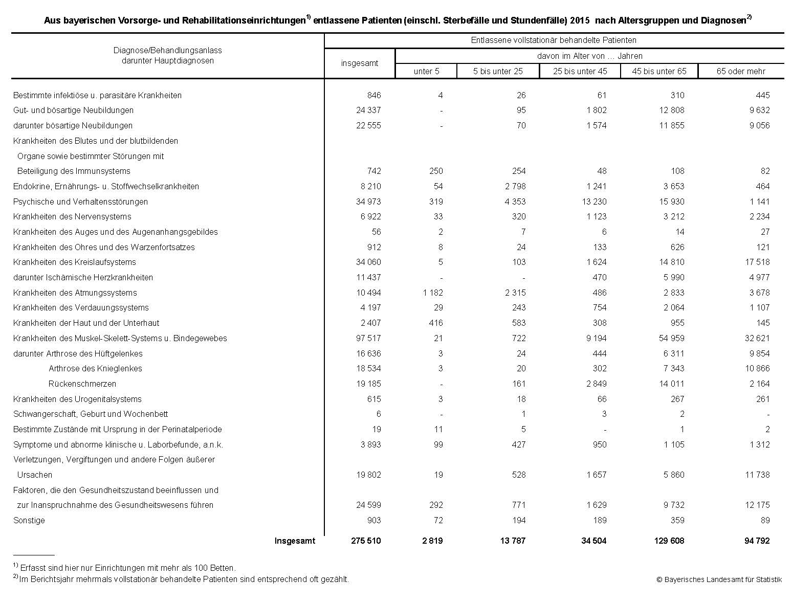 Wie das Bayerische Landesamt für Statistik mitteilt, wurden im Jahr 2015 in den bayerischen Vorsorge- und Rehabilitationseinrichtungen mit mehr als 100 Betten 275 510 vollstationäre Behandlungsfälle verzeichnet, das sind 436 Behandlungsfälle mehr als 2014 und damit nahezu unverändert (+0,2 Prozent).