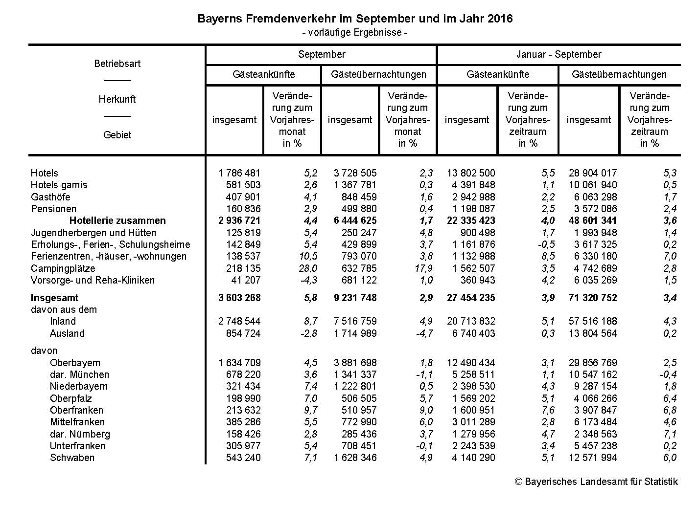 Wie das Bayerische Landesamt für Statistik nach den vorläufigen Ergebnissen der Monatserhebung im Tourismus berichtet, stieg die Zahl der Gästeankünfte in den Beherbergungsbetrieben*) Bayerns in den ersten neun Monaten 2016 gegenüber dem Vorjahreszeitraum um 3,9 Prozent auf knapp 27,5 Millionen, die Zahl der Übernachtungen erhöhte sich um 3,4 Prozent auf gut 71,3 Millionen.