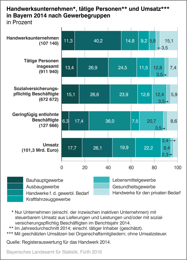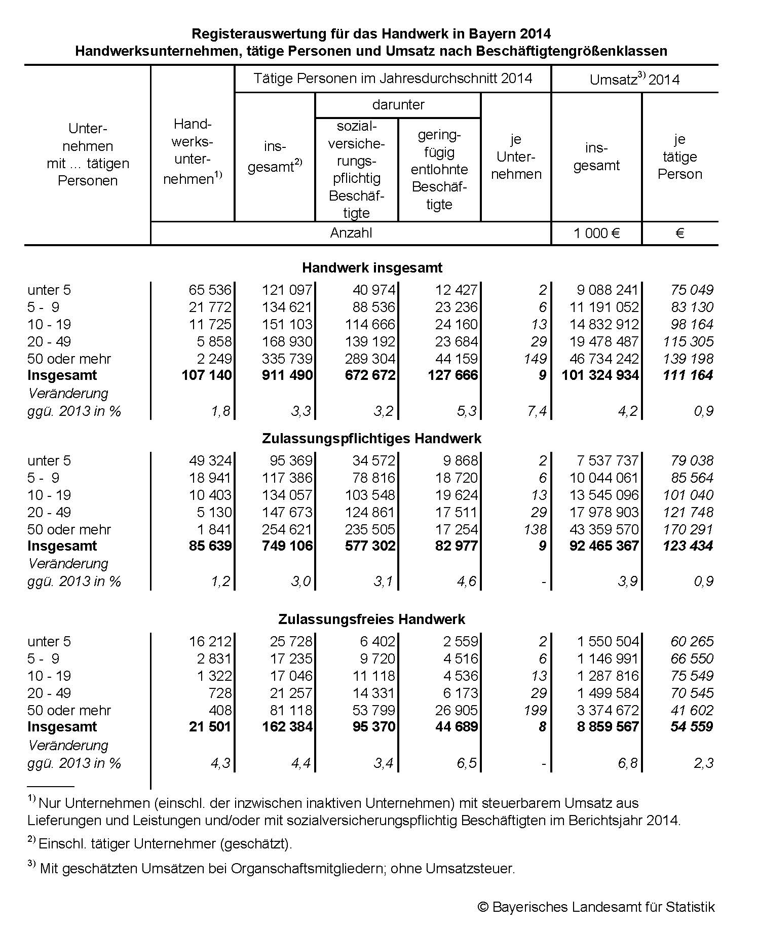 Wie das Bayerische Landesamt für Statistik nach Ergebnissen der aktuellsten registerbasierten Handwerkszählung mitteilt, gab es in Bayern im Jahr 2014 insgesamt 107 140 selbstständige Handwerksunternehmen (+1,8 Prozent gegenüber 2013).