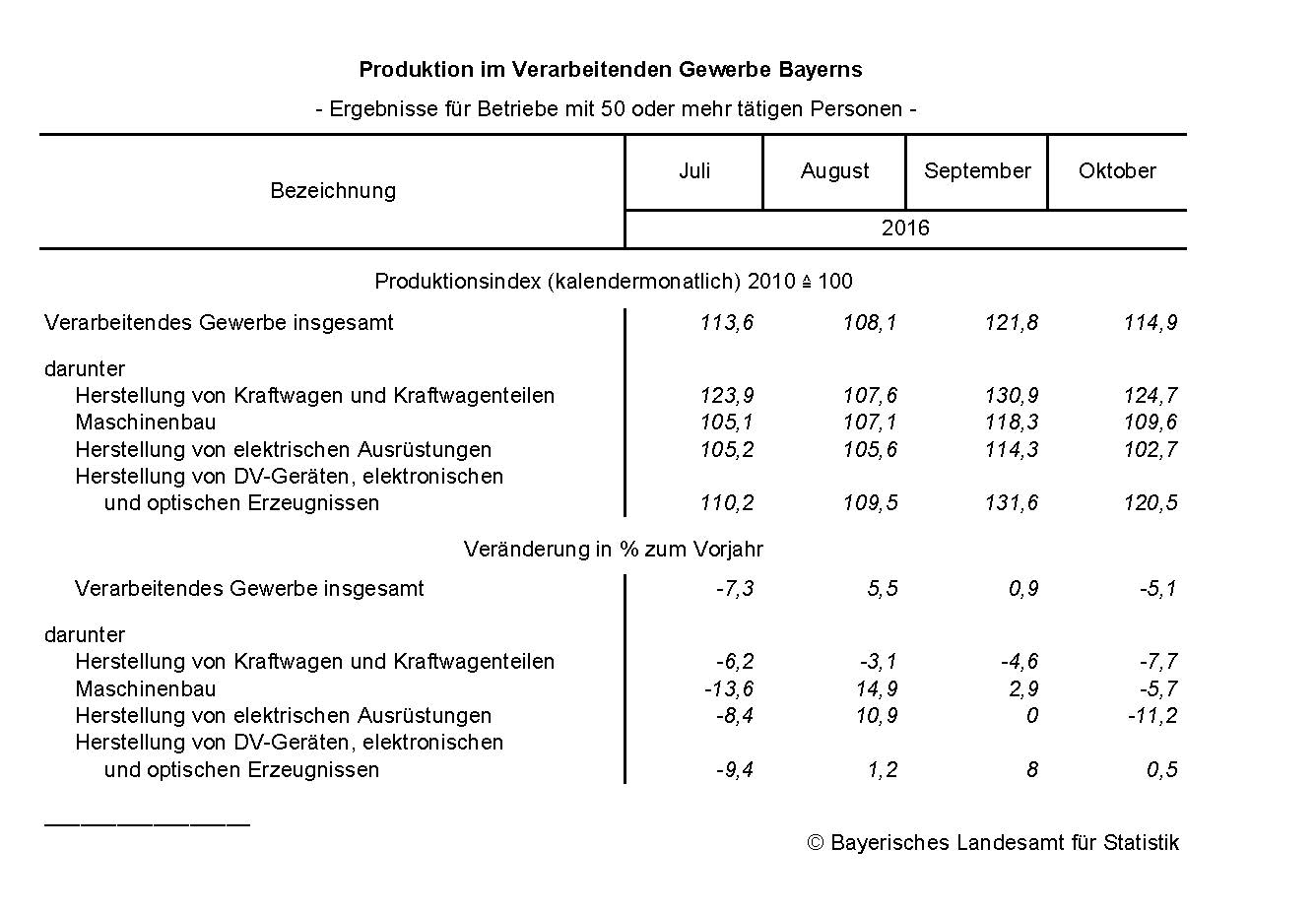 Nach Angaben des Bayerischen Landesamts für Statistik musste die Produktion des Verarbeitenden Gewerbes im Oktober 2016 einen deutlichen Rückgang von 5,1 Prozent gegenüber dem Vorjahresergebnis hinnehmen. Die ersten zehn Monate des Jahres 2016 erbrachten demgegenüber ein Plus von 2,1 Prozent.