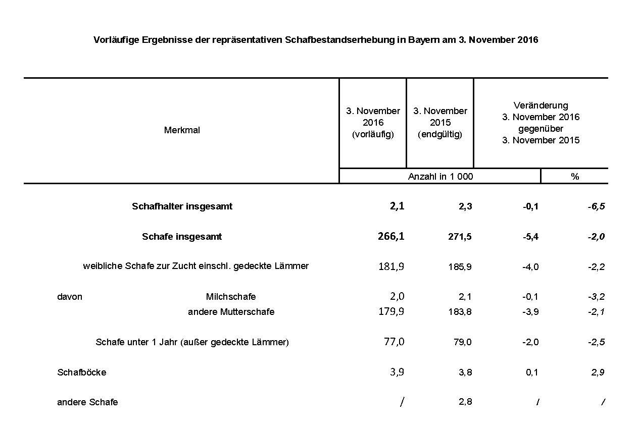 Nach den vorläufigen Ergebnissen der vom Bayerischen Landesamt für Statistik durchgeführten Schafbestandserhebung zum 3. November 2016 sank die Anzahl der bayerischen Schafhaltungsbetriebe auf rund 2 100. Dies entspricht im Vorjahresvergleich einem Rückgang von 6,5 Prozent. Der Bestand der Schafe verringerte sich dabei um 2,0 Prozent auf 266 100 Tiere.