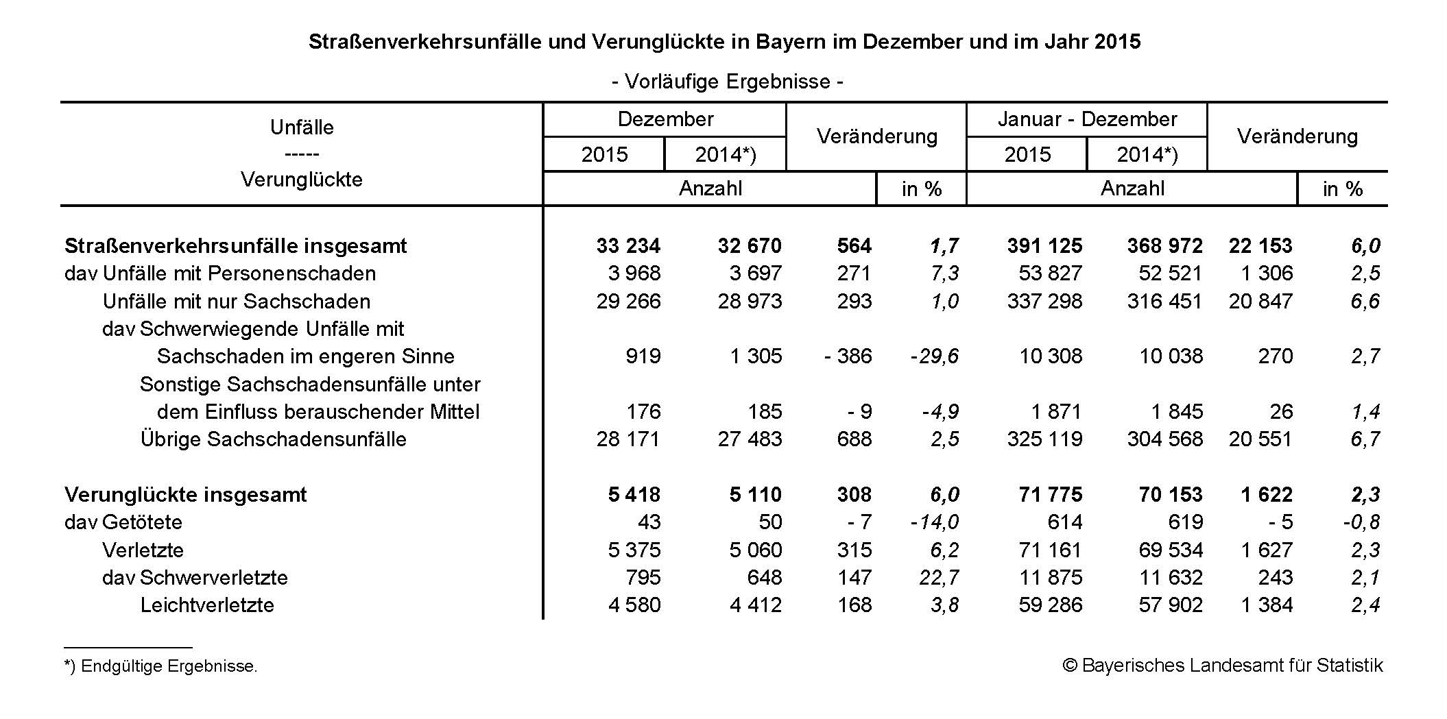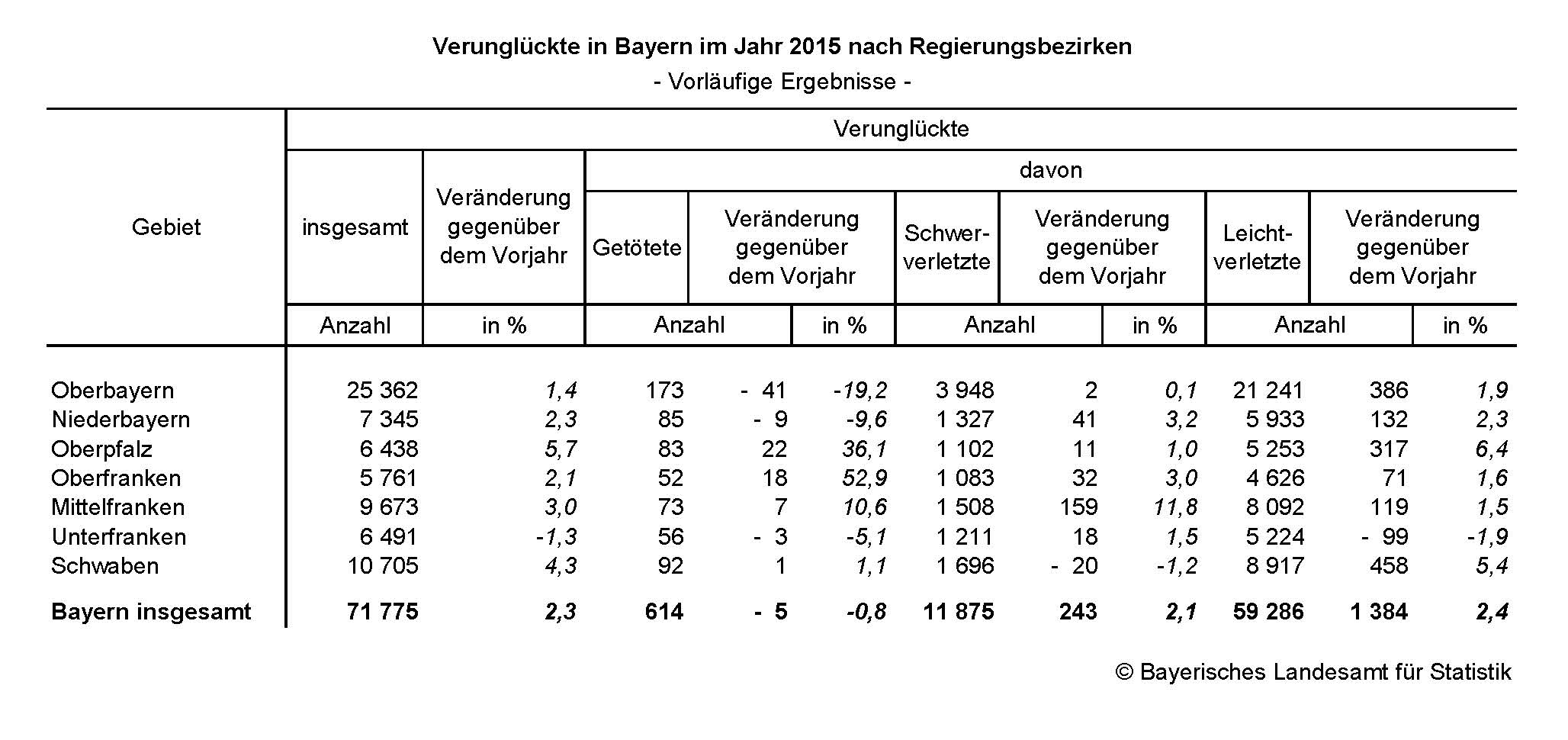Im Jahr 2015 verunglückten insgesamt 71 775 Menschen auf Bayerns Straßen (+2,3 Prozent gegenüber 2014). Es kamen 614 Menschen ums Leben (-0,8 Prozent), 71 161 (+2,3 Prozent) wurden verletzt.
