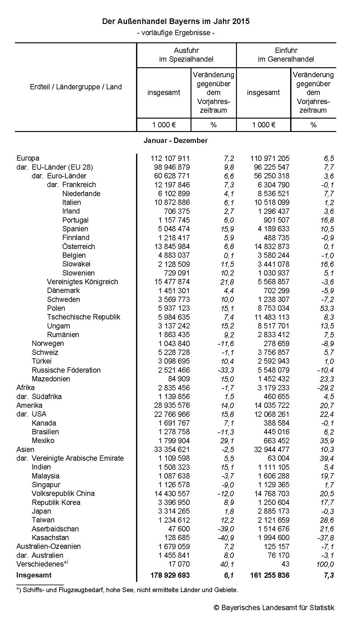 Nach vorläufigen Ergebnissen des Bayerischen Landesamts für Statistik exportierte die bayerische Wirtschaft im Jahr 2015 Waren im Wert von über 178,9 Milliarden Euro, dies sind 6,1 Prozent mehr als im Vorjahr. In die EU-Mitgliedsstaaten wurden Waren im Wert von über 98,9 Milliarden Euro geliefert (+9,8 Prozent), darunter wurden Waren im Wert von gut 60,6 Milliarden Euro in die Euro-Länder ausgeführt (+6,6 Prozent).