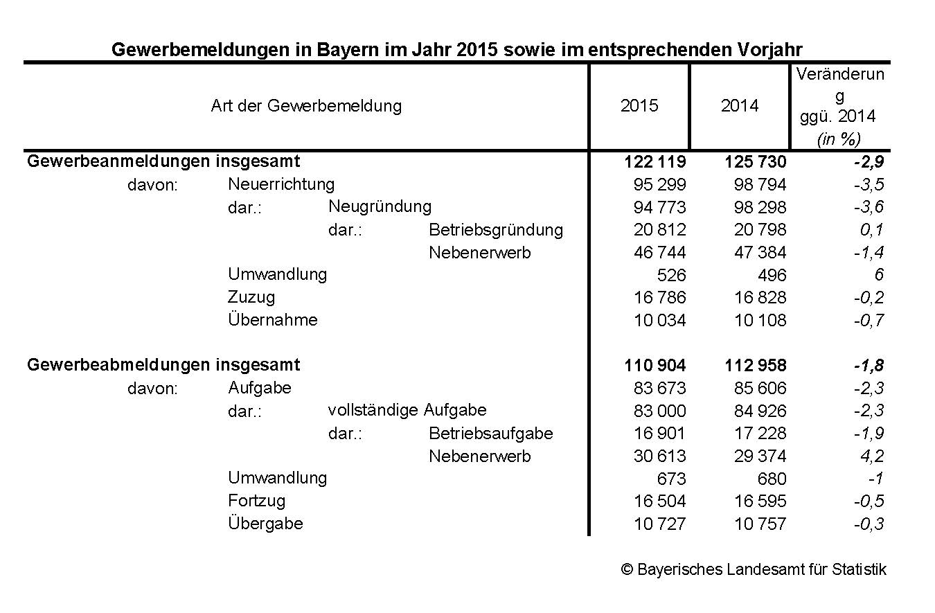 Nach Angaben des Bayerischen Landesamts für Statistik wurden bei den Gewerbeämtern in Bayern im Jahr 2015 insgesamt 94 773 Neugründungen und 83 000 vollständige Aufgaben gemeldet. Gegenüber dem Jahr 2015 ist die Zahl der Neugründungen damit um 3,6 Prozent zurückgegangen. Die vollständigen Aufgaben verzeichneten ebenfalls einen Rückgang um 2,3 Prozent. Von den 94 773 Neugründungen entfielen 20 812 bzw. 22,0 Prozent auf Betriebsgründungen, d.h. auf Gründungen von Gewerben mit voraussichtlich größerer wirtschaftlicher Bedeutung. Die Anzahl der Betriebsgründungen lag nur knapp über dem entsprechenden Wert des Vorjahres. Demgegenüber belief sich die Anzahl der Betriebsaufgaben im Berichtszeitraum auf insgesamt 16 901 Fälle und lag damit um 1,9 Prozent (insgesamt 327) unter dem entsprechenden Vorjahreswert. Der Gründungssaldo mit 11 773 mehr Neugründungen als vollständigen Aufgaben von Gewerben ist weiterhin Indikator für einen anwachsenden Gewerbebestand in Bayern, hat sich aber gegenüber dem Vorjahr um 12,0 Prozent verringert.