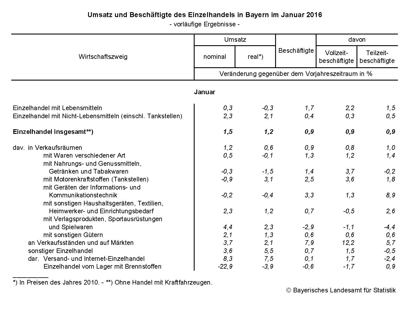 Nach ersten Ergebnissen des Bayerischen Landesamts für Statistik wuchs der Umsatz im bayerischen Einzelhandel (ohne Kraftfahrzeughandel) im Januar 2016 im Vergleich zum Vorjahresmonat nominal um 1,5 Prozent und real um 1,2 Prozent. Die Zahl der Vollzeitbeschäftigten und der Teilzeitbeschäftigten stieg jeweils um 0,9 Prozent.