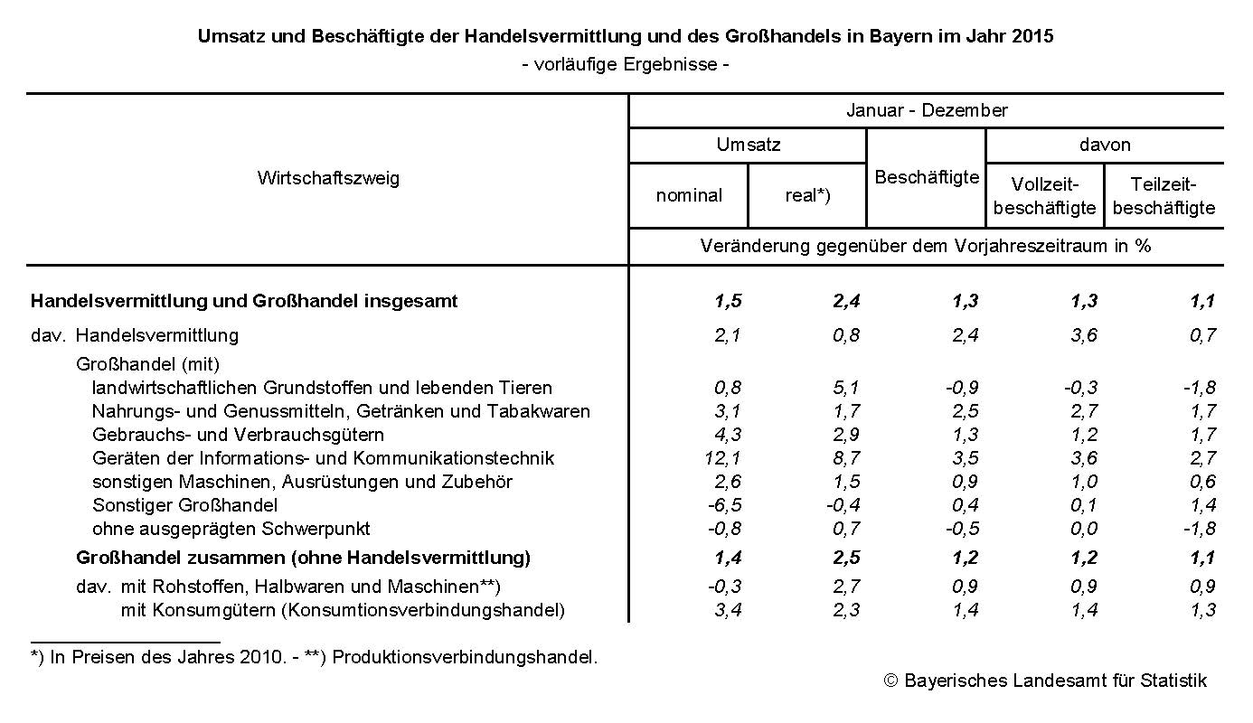 Der Umsatz im bayerischen Großhandel (einschl. der Handelsvermittlung) erhöhte sich nach vorläufigen Ergebnissen des Bayerischen Landesamts für Statistik im Jahr 2015 gegenüber dem Vorjahr nominal um 1,5 Prozent und real um 2,4 Prozent. Die Zahl der Beschäftigten nahm um 1,3 Prozent zu, wobei die Zahl der Vollzeitbeschäftigten um 1,3 Prozent und die Zahl der Teilzeitbeschäftigten um 1,1 Prozent stiegen.