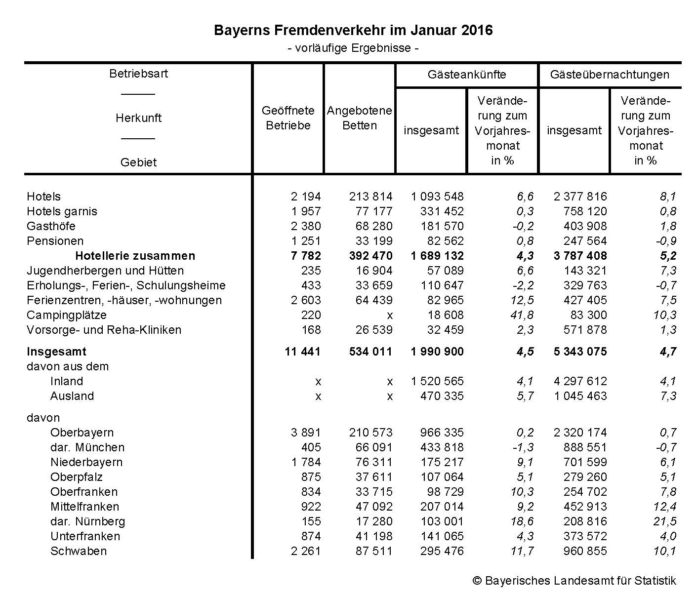 Wie das Bayerische Landesamt für Statistik nach vorläufigen Ergebnissen mitteilt, stieg die Zahl der Gästeankünfte in den 11 400 geöffneten Beherbergungsbetrieben*) Bayerns im Januar 2016 im Vergleich zum Vorjahresmonat um 4,5 Prozent auf 2,0 Millionen, die Zahl der Übernachtungen wuchs um 4,7 Prozent auf 5,3 Millionen.