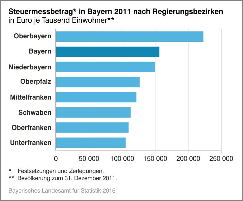 Nach Mitteilung des Bayerischen Landesamts für Statistik wurde in Bayern im Jahr 2011 bei den insgesamt 570 857 gewerbesteuerpflichtigen Betrieben ein Gewerbesteuermessbetrag von gut 1,95 Milliarden Euro erhoben. Damit übertraf der im Jahr 2011 festgesetzte Gewerbesteuermessbetrag den entsprechenden Vorjahreswert um 13,8 Prozent. Die Anzahl der gewerbesteuerpflichtigen Betriebe lag um 4,1 Prozent über dem Wert von 2010. Von den gewerbesteuerpflichtigen Betrieben wiesen 43,1 Prozent einen positiven Gewerbemessbetrag aus und trugen somit zum Gewerbesteueraufkommen bei; hingegen wiesen 56,9 Prozent der steuerpflichtigen Betriebe einen Steuermessbetrag von Null aus, entweder weil sie im Jahr 2011 Verluste gemacht hatten oder über einen ausreichend hohen Freibetrag verfügten. – Von den insgesamt 1,95 Milliarden Euro an Gewerbesteuermessbetrag entfielen 361,1 Millionen Euro auf die Landeshauptstadt München; der Regierungsbezirk Oberbayern verzeichnete außerdem mit 223 434 Euro den mit Abstand höchsten Gewerbesteuermessbetrag pro 1 000 Einwohner unter allen bayerischen Regierungsbezirken.