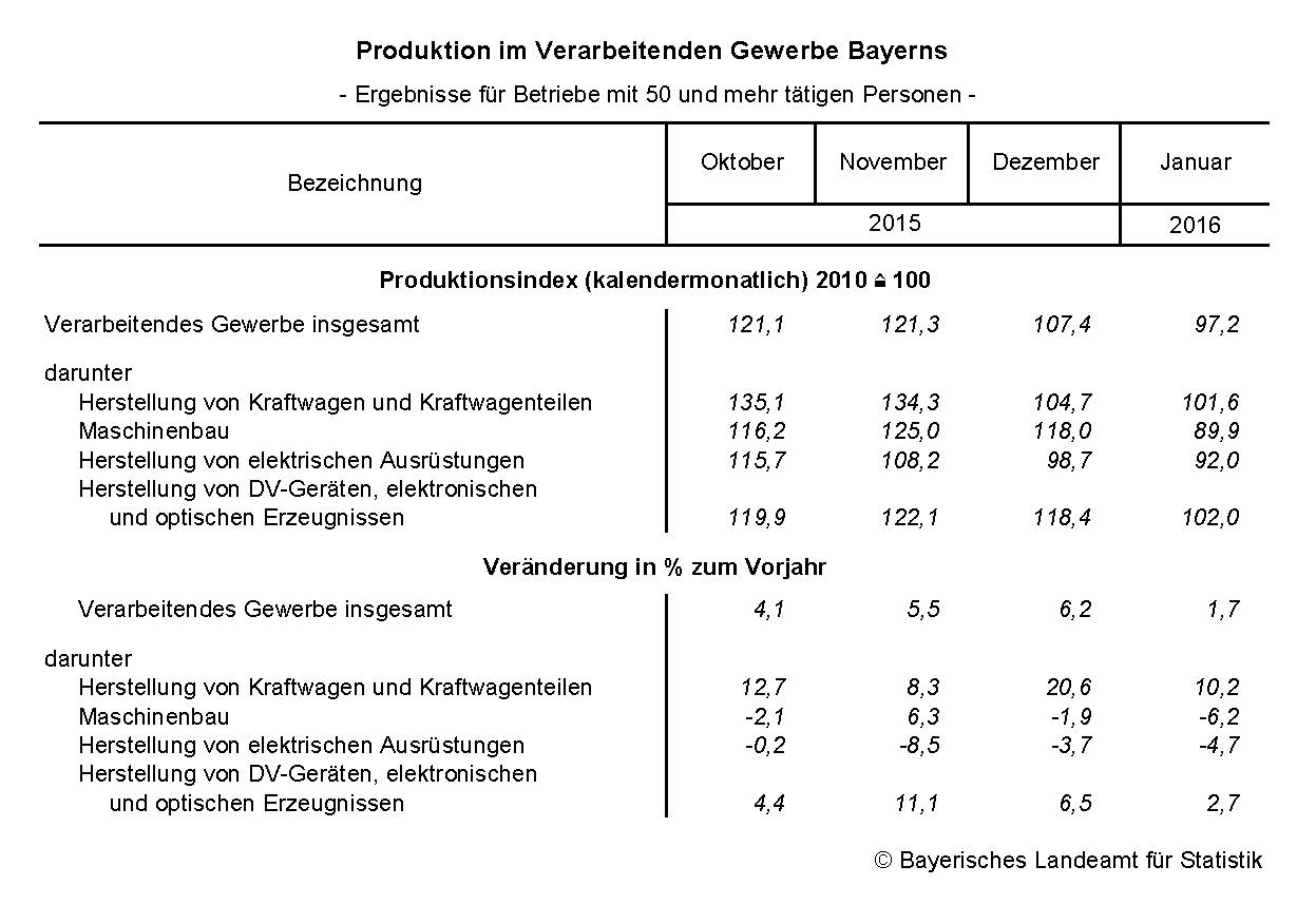 Die Produktion der bayerischen Industrie (Verarbeitendes Gewerbe sowie Bergbau und Gewinnung von Steinen und Erden, bezogen auf den Berichtskreis „Betriebe mit 50 oder mehr Beschäftigten“) verzeichnete im Januar 2016 ein Plus von 1,7 Prozent gegenüber dem Vorjahresergebnis.