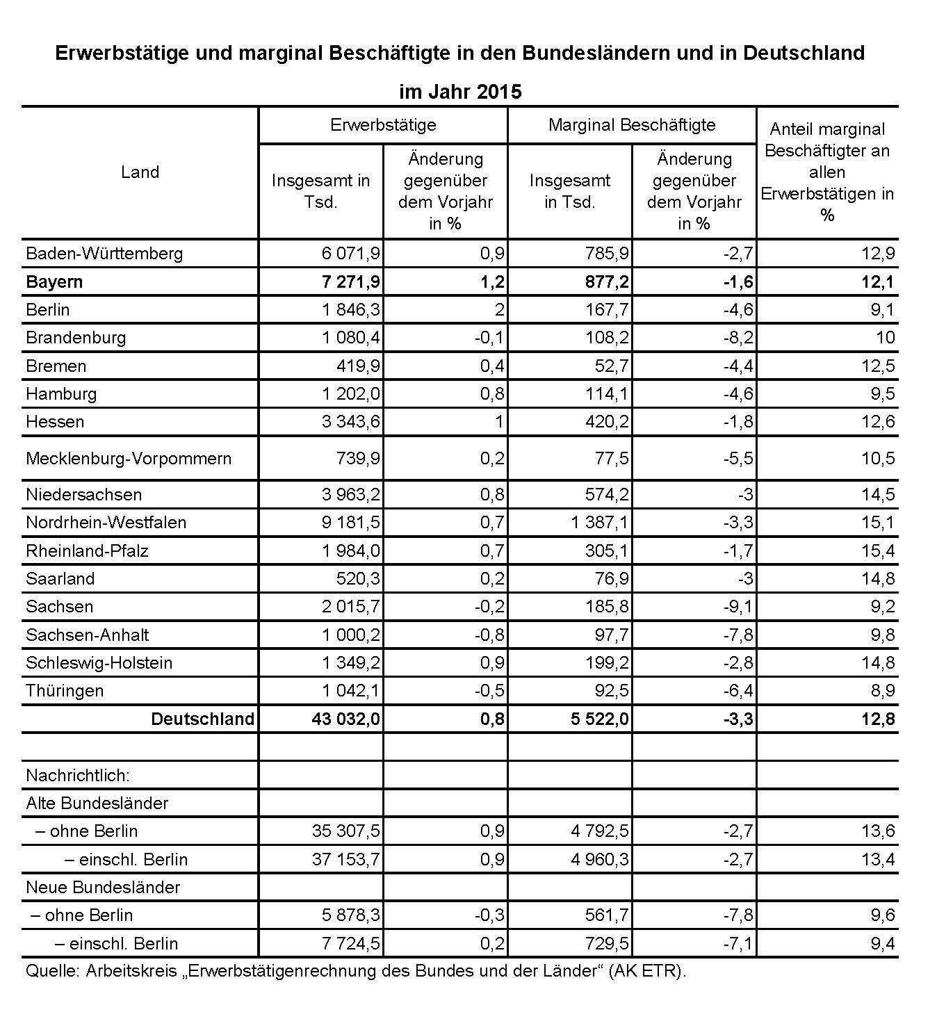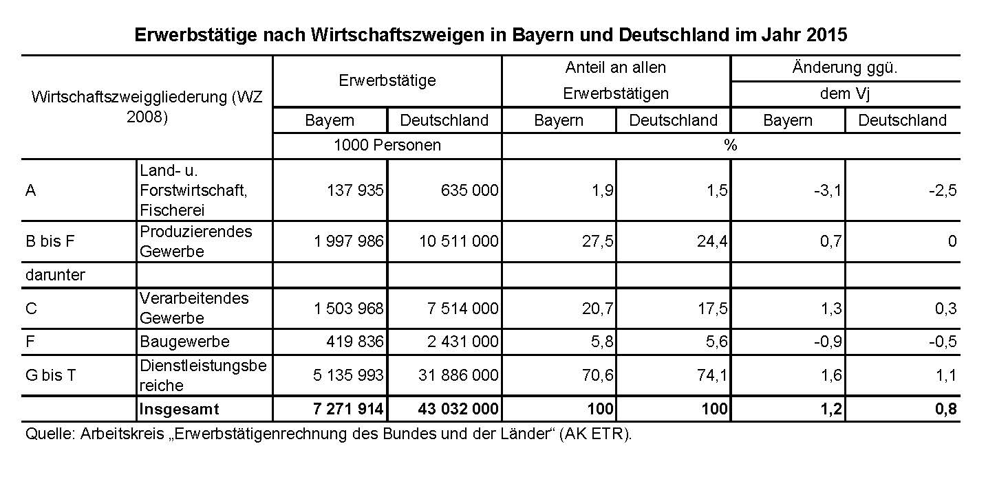 Auch im Jahr 2015 erhöhte sich nach Mitteilung des Bayerischen Landesamts für Statistik in Bayern die Beschäftigung weiter. Die Zahl der Erwerbstätigen stieg um 1,2 Prozent auf 7,27 Millionen an. Hiervon waren 0,88 Millionen marginal Beschäftigte. Die Zahl der marginal Beschäftigten sank um 1,6 Prozent. Überdurchschnittlich wuchs die Erwerbstätigenzahl in den Dienstleistungsbereichen mit 1,6 Prozent. Im Produzierenden Gewerbe (ohne Baugewerbe) gab es eine Zunahme um 1,2 Prozent, während das Baugewerbe mit -0,9 Prozent sowie die Land- und Forstwirtschaft mit -3,1 Prozent einen Beschäftigungsrückgang verzeichneten.