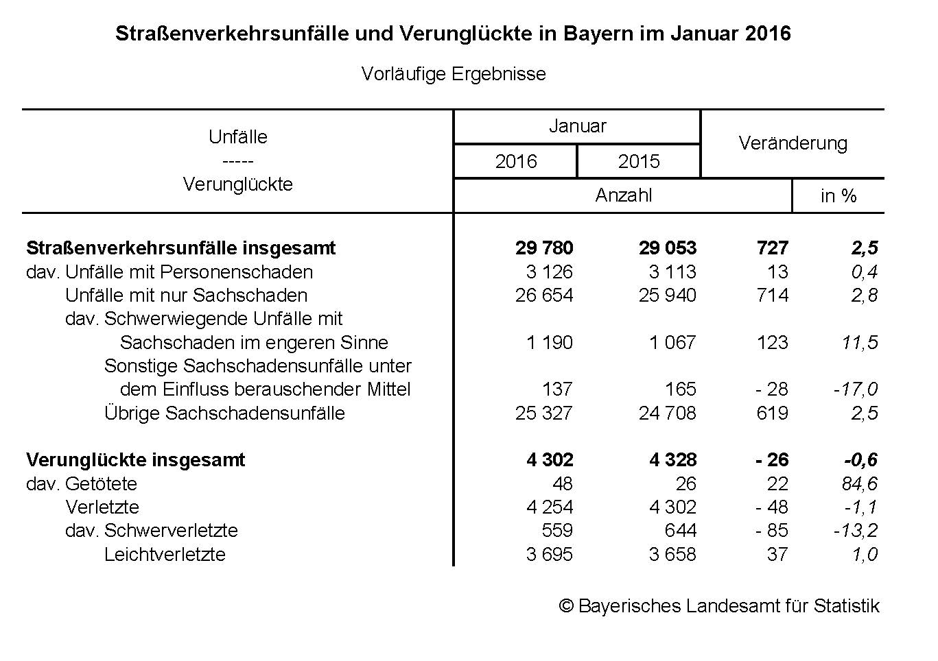 Im Januar 2016 ereigneten sich auf Bayerns Straßen nach den vorläufigen Meldungen der Polizei insgesamt 29 780 Unfälle und somit 2,5 Prozent mehr als im Vorjahresmonat. Nach Mitteilung des Bayerischen Landesamts für Statistik stiegen Unfälle mit Personenschaden lediglich leicht um 0,4 Prozent, während Sachschadensunfälle um 2,8 Prozent zunahmen. Die Zahl der Verunglückten sank um 0,6 Prozent auf 4 302 Fälle insgesamt. Es wurden 48 Verkehrsteilnehmer getötet (+84,6 Prozent), 559 schwer (-13,2 Prozent) und 3 695 leicht verletzt (+1,0 Prozent).
