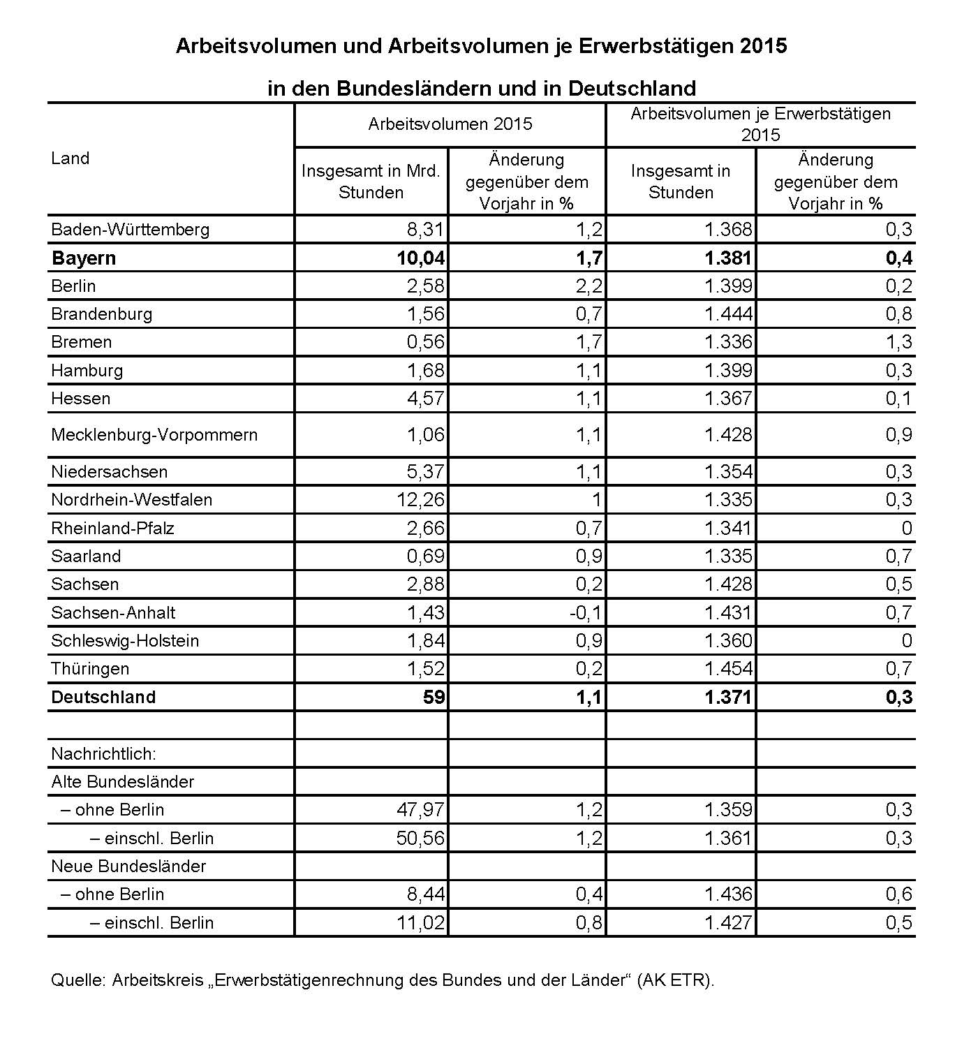 Die hier vorgelegten Daten beruhen auf einer Berechnung des Arbeitsvolumens 2015 des Arbeitskreises „Erwerbstätigenrechnung des Bundes und der Länder“ (AK ETR), dem alle Statistischen Landesämter, das Statistische Bundesamt sowie der Deutsche Städtetag angehören. Weitere Ergebnisse zum Arbeitsvolumen können auf der Homepage des AK ETR unter www.ak-etr.de abgerufen werden.