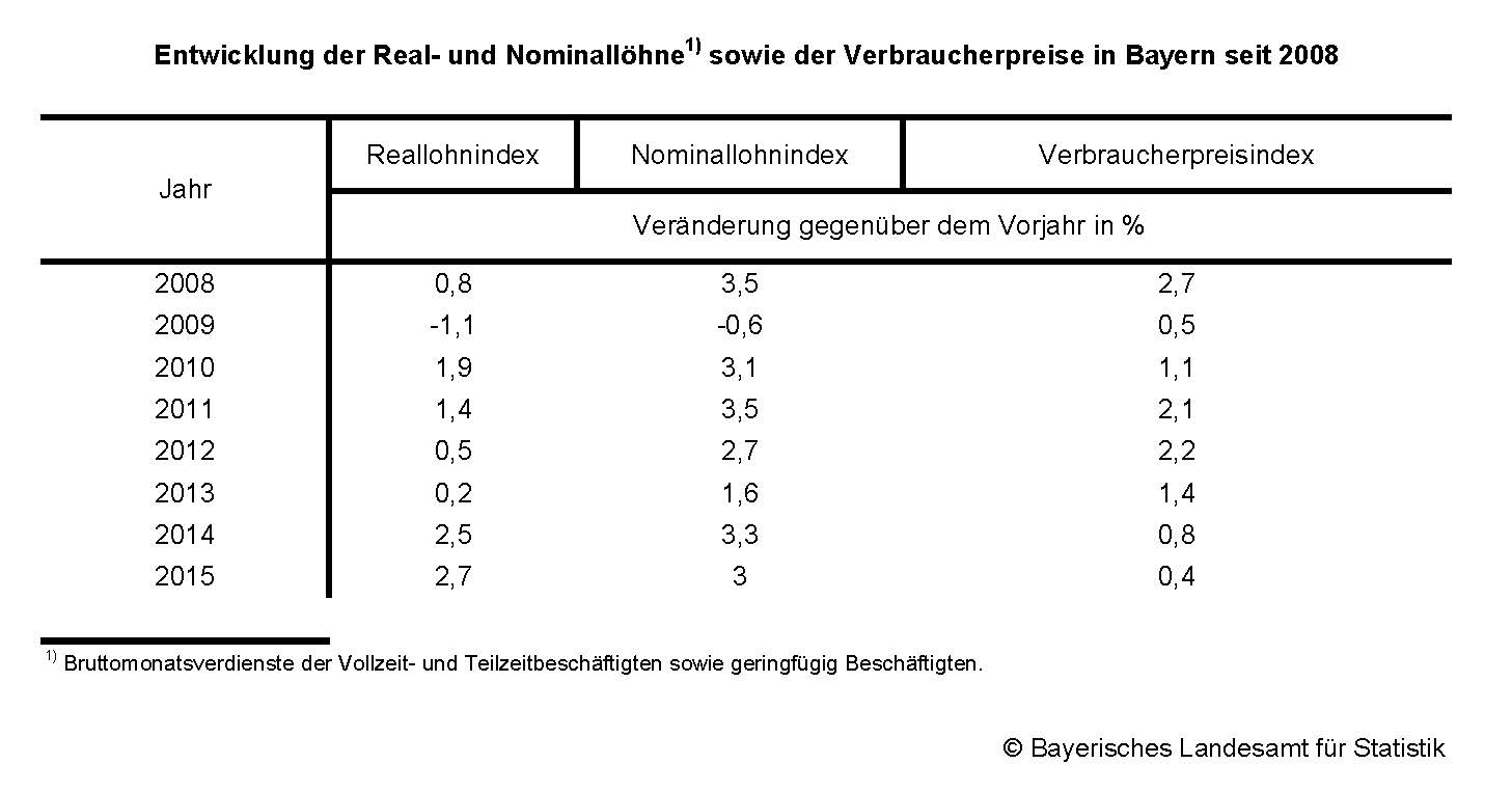 Bayerische Arbeitnehmer verdienten im Jahr 2015 real, also preisbereinigt, durchschnittlich 2,7 Prozent mehr als im Jahr 2014. Dies war der höchste Zuwachs seit Beginn der Zeitreihe des Reallohnindex im Jahr 2008. Nach Berechnungen des Bayerischen Landesamts für Statistik erhöhten sich im Jahr 2015 die Verdienste nominal um 3,0 Prozent, wohingegen die Verbraucherpreise lediglich um 0,4 Prozent zulegten.