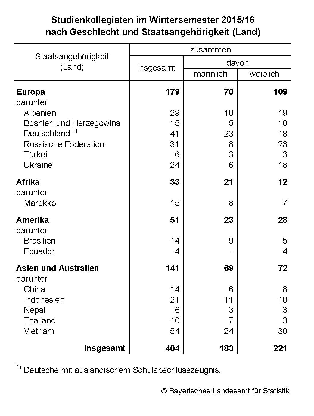 Im Wintersemester 2015/16 bereiteten sich 221 Frauen und 183 Männer an einem bayerischen Studienkolleg sprachlich und fachlich auf ein Studium in Deutschland vor. Wie das Bayerische Landesamt für Statistik weiter mitteilt, wollen 269 oder 66,6 Prozent der Studienkollegiaten in entsprechenden Kursen eine Hochschulzugangsberechtigung erwerben, die der deutschen allgemeinen bzw. fachgebundenen Hochschulreife gleichwertig ist. Gegenüber dem Wintersemester 2014/15 (442) ist die Zahl der Studienkollegiaten insgesamt um 8,6 Prozent zurückgegangen.
