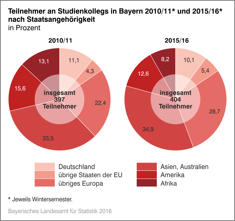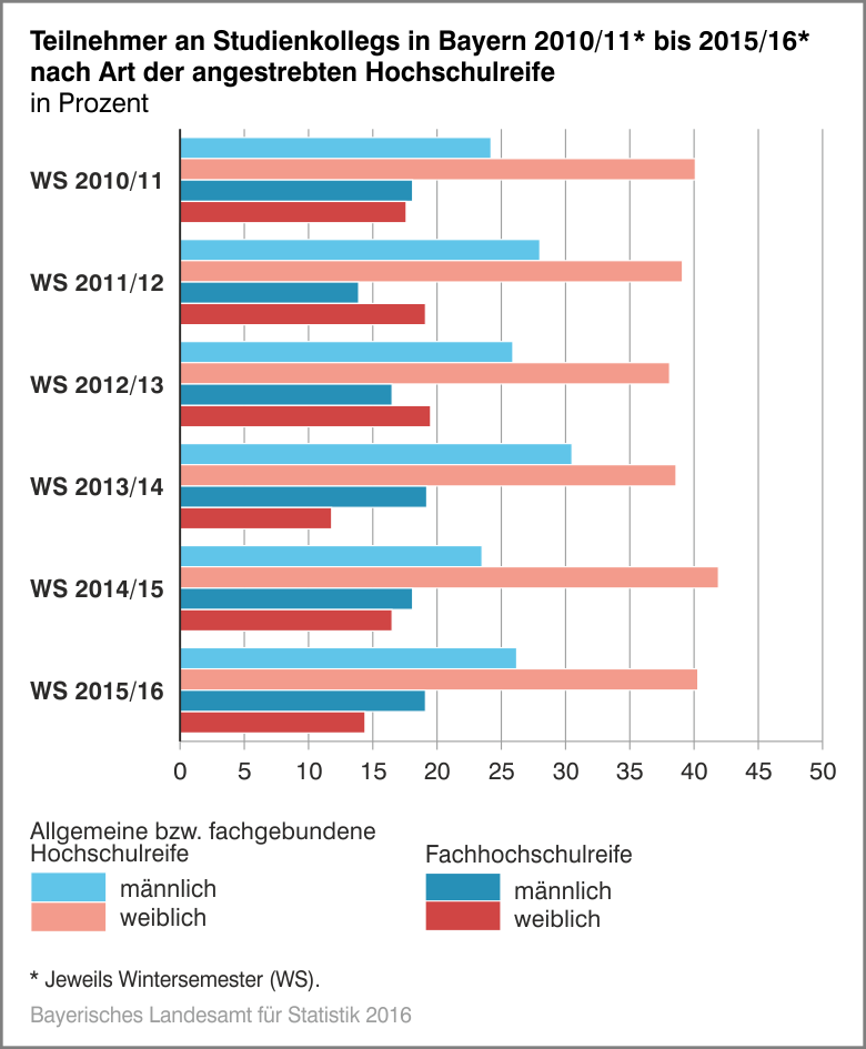 Im Wintersemester 2015/16 besuchten laut Bayerischem Landesamt für Statistik 404 Studienbewerberinnen und -bewerber ein solches Kolleg. Das waren 38 oder 8,6 Prozent weniger als im vorangegangenen Wintersemester. 2010/11 waren 397 Kollegteilnehmer zu verzeichnen.
