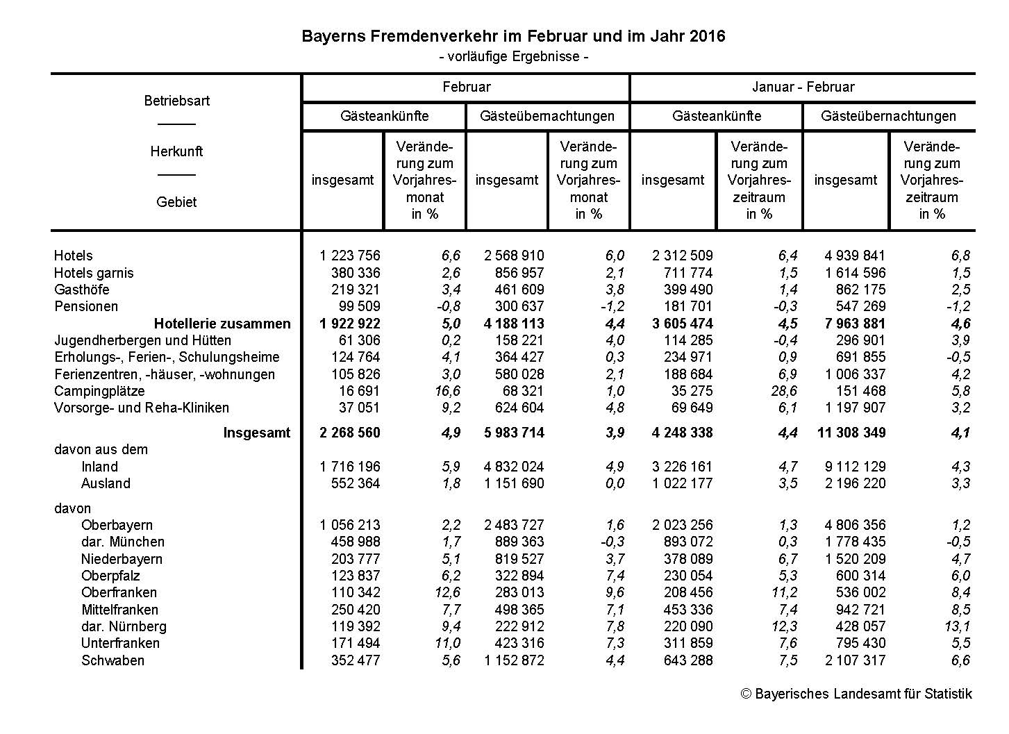 Im Januar und Februar 2016 zusammen nahm die Zahl der Gästeankünfte in Bayern gegenüber dem Vorjahreszeitraum um 4,4 Prozent auf gut 4,2 Millionen zu, die Zahl der Übernachtungen stieg um 4,1 Prozent auf rund 11,3 Millionen.