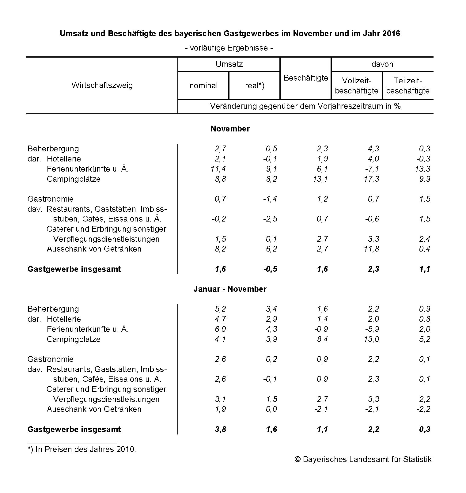 Von Januar bis November 2016 erhöhte sich der Umsatz des bayerischen Gastgewerbes im Vergleich zum Vorjahreszeitraum nominal um 3,8 Prozent und real um 1,6 Prozent. Die Zahl der Beschäftigten des Gastgewerbes stieg um 1,1 Prozent.