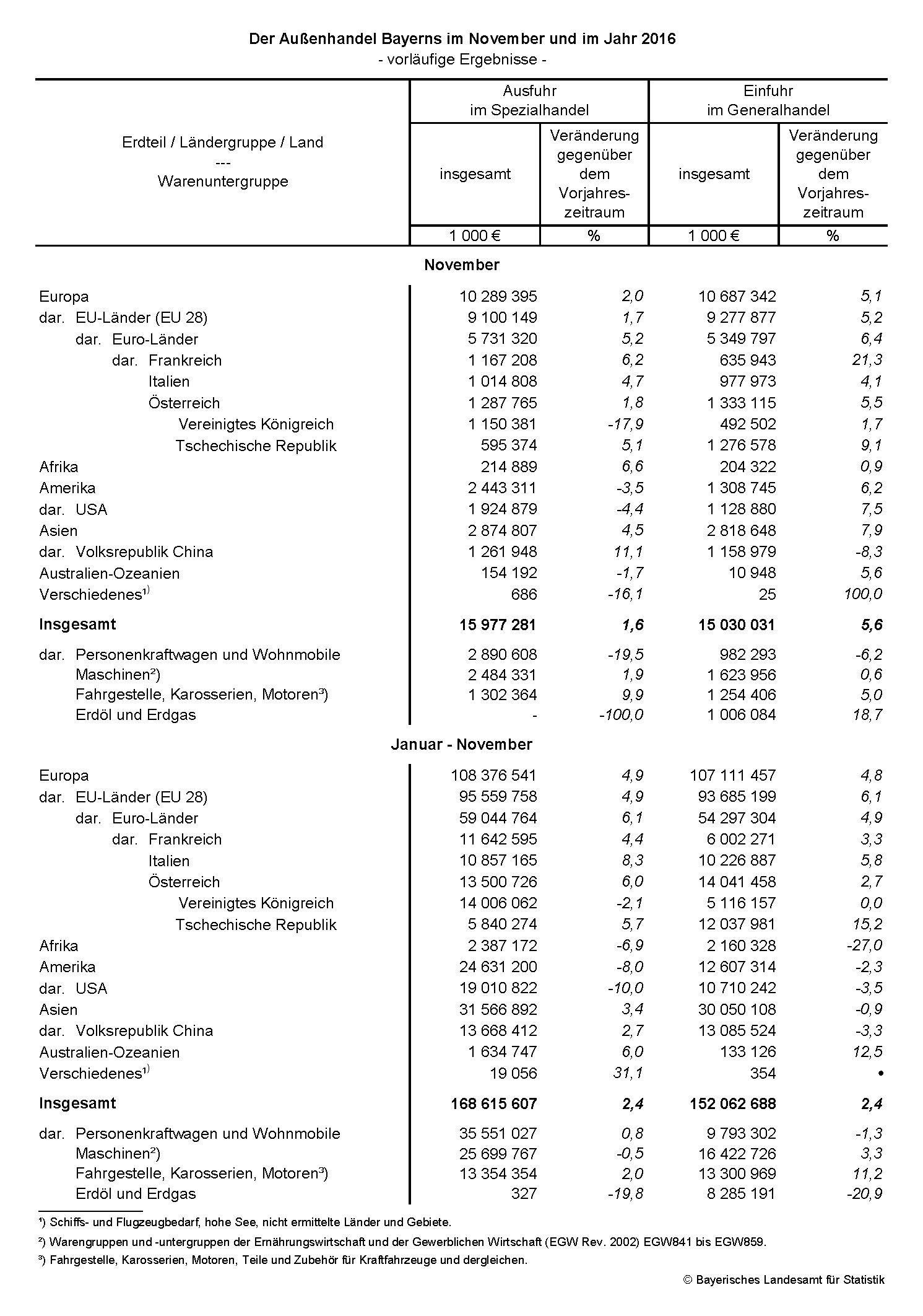 Von Januar bis November 2016 erzielte Bayerns Wirtschaft ein Exportvolumen von gut 168,6 Milliarden Euro (+2,4 Prozent gegenüber dem Vorjahreszeitraum) und ein Importvolumen von knapp 152,1 Milliarden Euro (+2,4 Prozent).