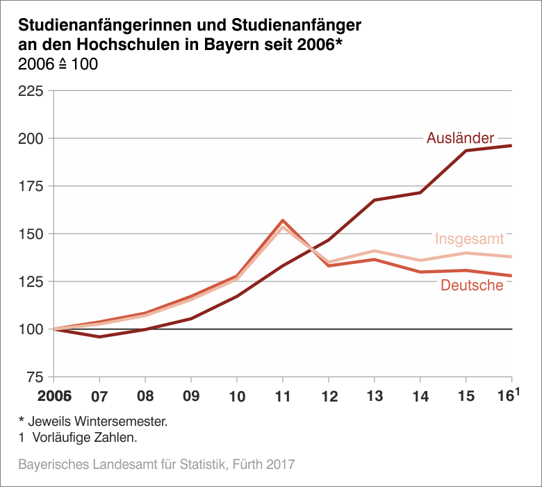Nachdem die Zahl der Studienanfänger im Sommersemester 2016 mit 8 084 nur leicht über dem entsprechenden Vorjahressemester (7 933) gelegen hatte, war im Wintersemester (65 338) ein leichter Rückgang der Erstsemesterzahlen um 1,4 Prozent zu verzeichnen. Im gesamten Studienjahr 2016 begannen 73 422 Personen in Bayern erstmals ein Studium, das waren 801 oder 1,1 Prozent weniger als im Studienjahr davor.