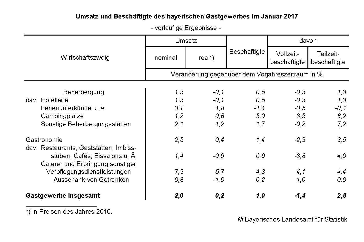 Nach den im Bayerischen Landesamt für Statistik vorliegenden, vorläufigen Ergebnissen der Monatsstatistik im Gastgewerbe wuchs der nominale Umsatz des bayerischen Gastgewerbes im Januar 2017 gegenüber dem Vorjahresmonat um 2,0 Prozent und der reale Umsatz um 0,2 Prozent. Die Zahl der Beschäftigten stieg um 1,0 Prozent.