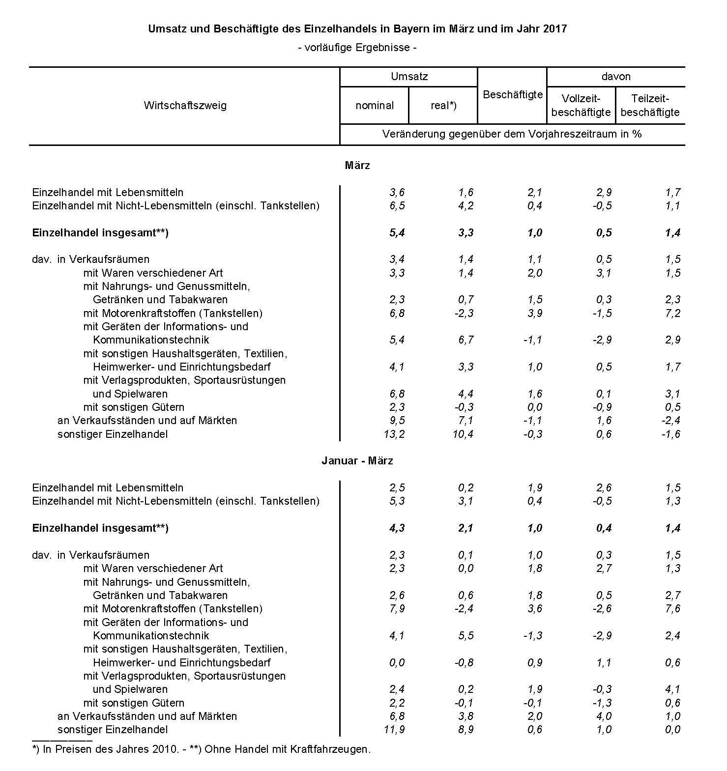 Im März 2017 erhöhte sich der nominale Umsatz des bayerischen Einzelhandels gegenüber dem Vorjahresmonat um 5,4 Prozent (real: +3,3 Prozent). Die Zahl der Beschäftigten nahm um 1,0 Prozent zu.