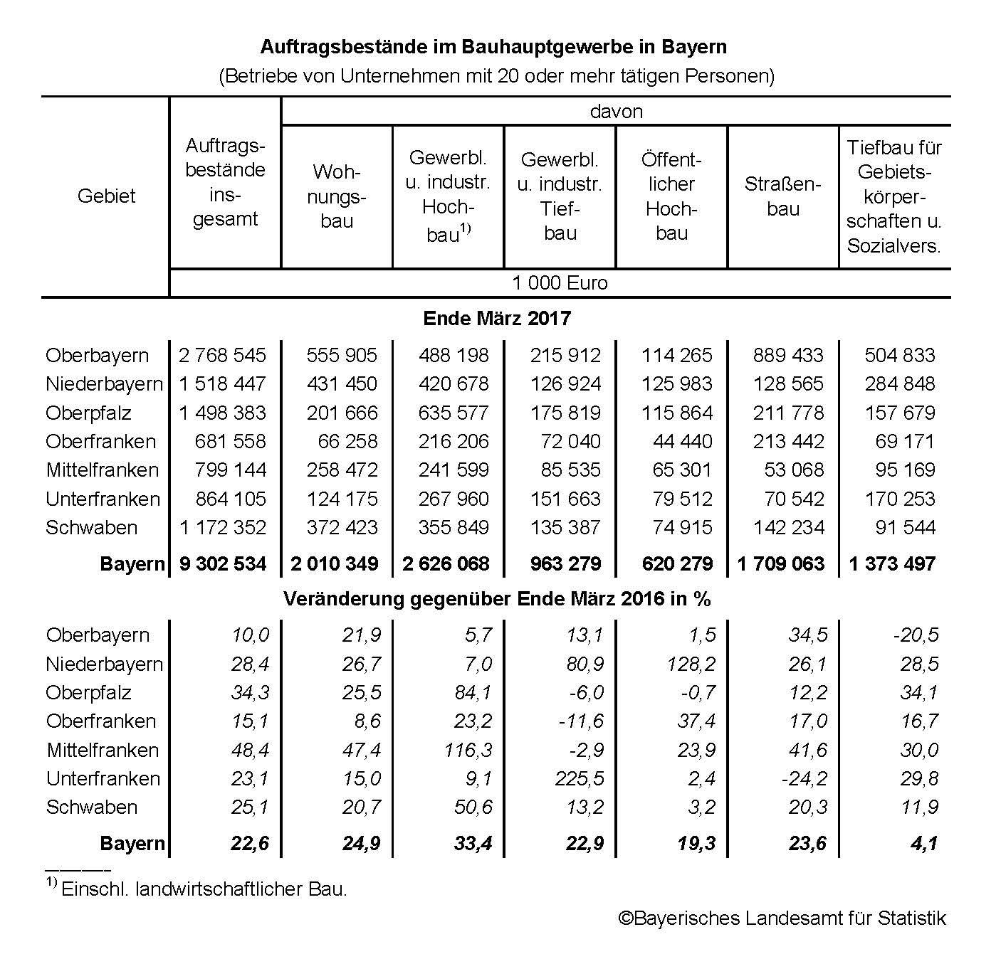 Bayerns Bauhauptgewerbe Ende März 2017 mit einem Auftragsbestand im Wert von 9,30 Milliarden Euro