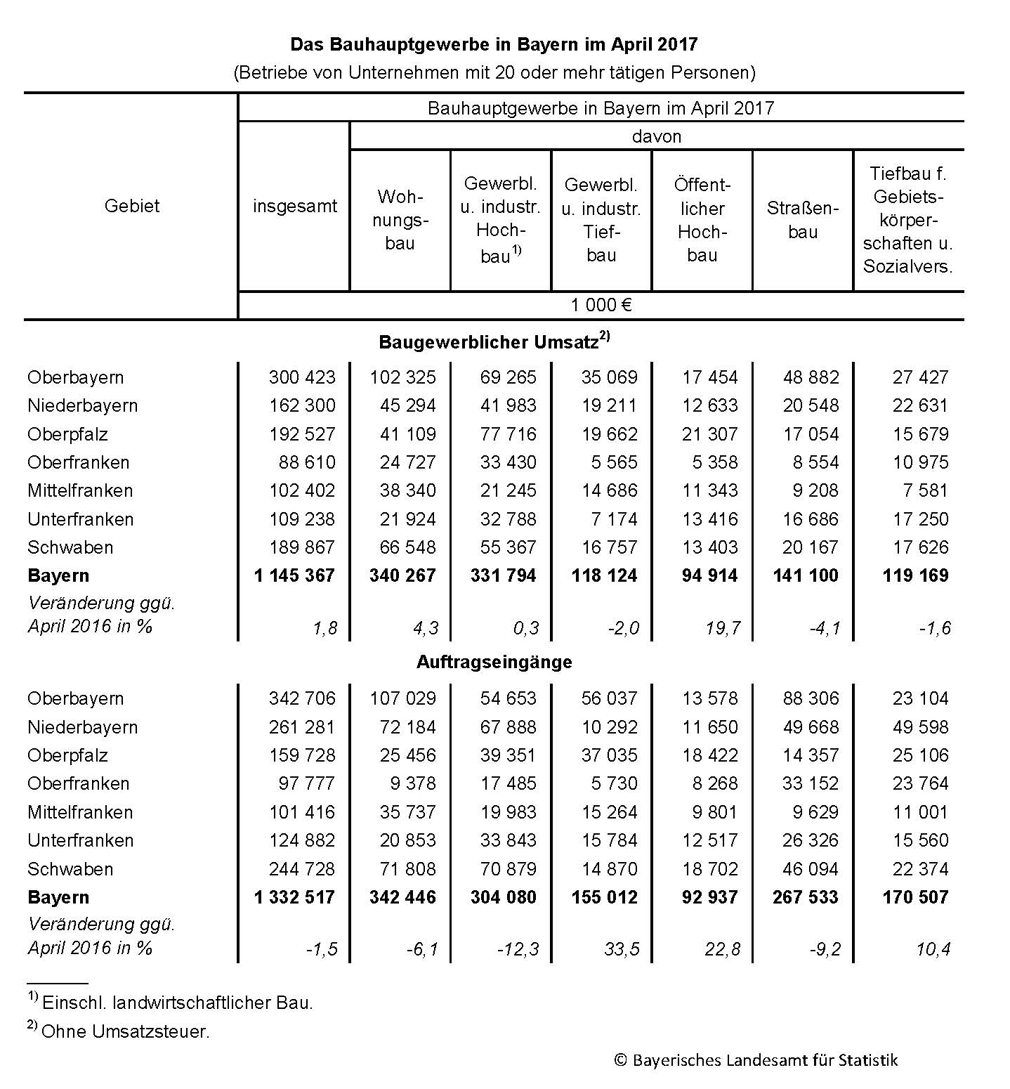 Das bayerische Bauhauptgewerbe verzeichnete Ende März 2017 einen Auftragsbestand im Gesamtwert von 9,30 Milliarden Euro. Nach Angaben des Bayerischen Landesamts für Statistik bedeutet dies im Vergleich zum Vorjahresergebnis einen wertmäßigen Anstieg um 22,6 Prozent. Dieser herausragende Zuwachs wurde von allen Bausparten getragen, darunter weit überdurchschnittlich vom gewerblichen und industriellen Hochbau, der gegenüber Ende März 2016 ein Plus von 33,4 Prozent verzeichnete. Den vergleichsweise relativ schwächsten Zuwachs mit 4,1 Prozent verbuchte der Tiefbau für Gebietskörperschaften und Sozialversicherungen. Den aktuellen bauhauptgewerblichen Auftragsbestand auf Ebene der Regierungsbezirke betrachtet, sind jeweilige Steigerungsraten zwischen 10,0 Prozent (Oberbayern) und 48,4 Prozent (Mittelfranken) festzustellen.