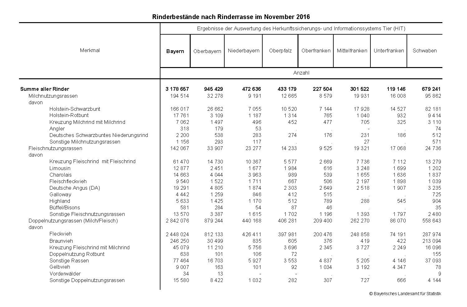 Wie das Bayerische Landesamt für Statistik mitteilt, wurden zum Stichtag 3. November 2016 insgesamt 47 442 landwirtschaftliche Haltungen mit einem Bestand von 3 178 657 Rindern in Bayern nachgewiesen. Zur Ermittlung der Rinderbestände werden die Ergebnisse aus der Datenbank HIT (Herkunftssicherungs- und Informationssystem für Tiere) herangezogen.