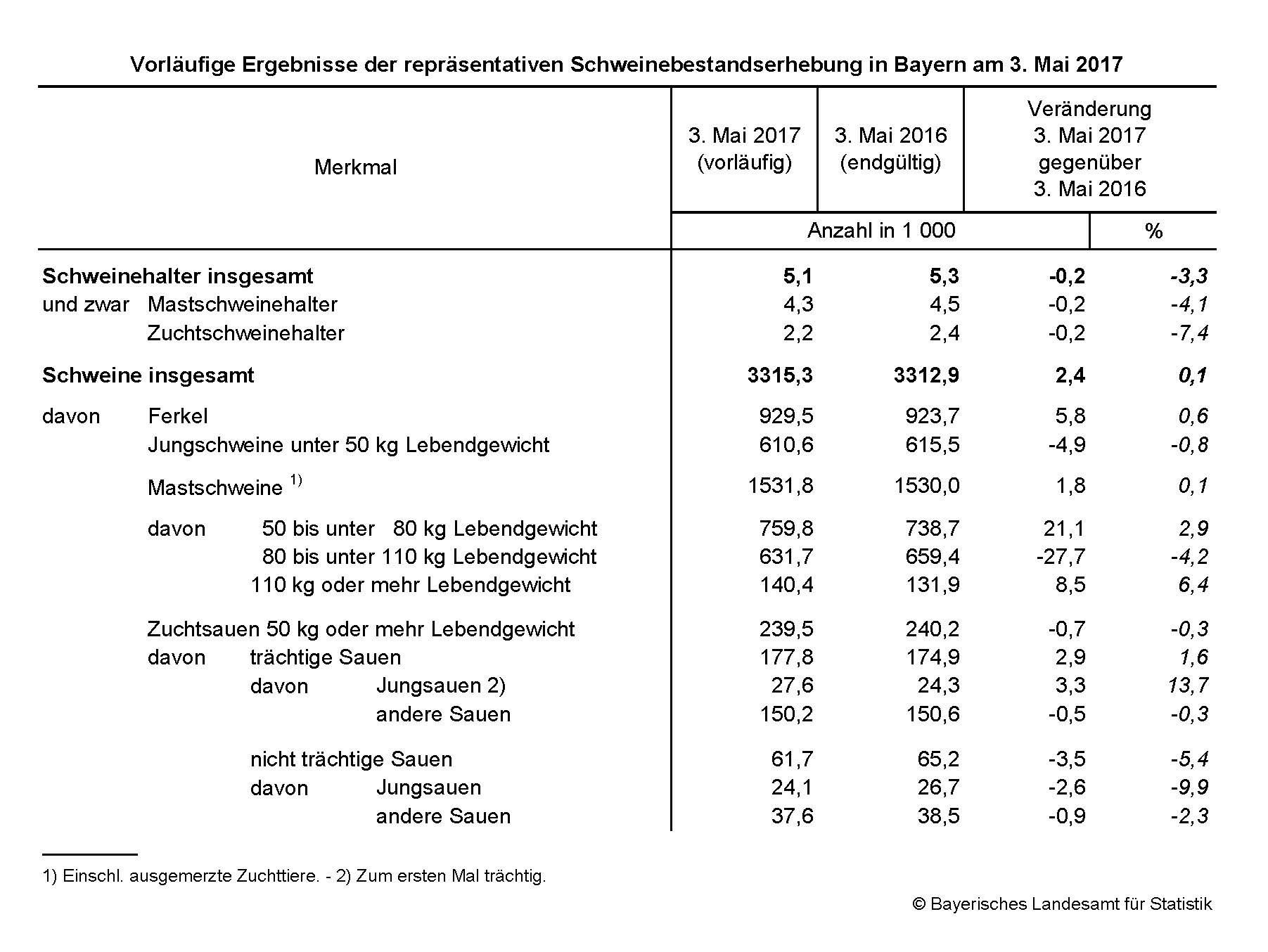 Nach den vorläufigen repräsentativen Ergebnissen der vom Landesamt für Statistik durchgeführten Erhebung über die Schweinebestände gab es in Bayern zum Stichtag 3. Mai 2017 rund 5 100 schweinehaltende Betriebe, die über mindestens 50 Schweine oder 10 Zuchtsauen verfügten. Insgesamt wurden in Bayern in diesen Betrieben 3 315 300 Schweine gehalten.
