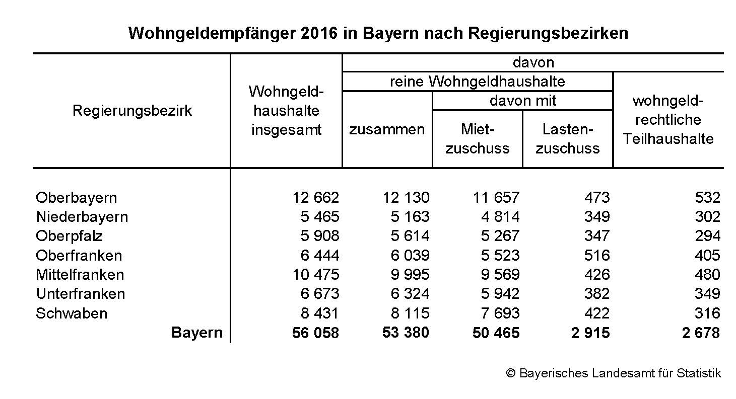 Nach Angaben des Bayerischen Landesamts für Statistik gab es zum Jahresende 2016 in Bayern insgesamt 53 380 reine Wohngeldhaushalte - das heißt, alle zum Haushalt zählenden Personen waren wohngeldberechtigt. Gegenüber 2015 mit 35 872 Wohngeldhaushalten entspricht dies einem Plus von 49 Prozent.