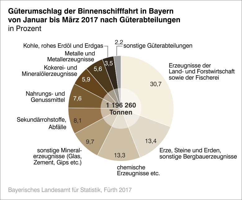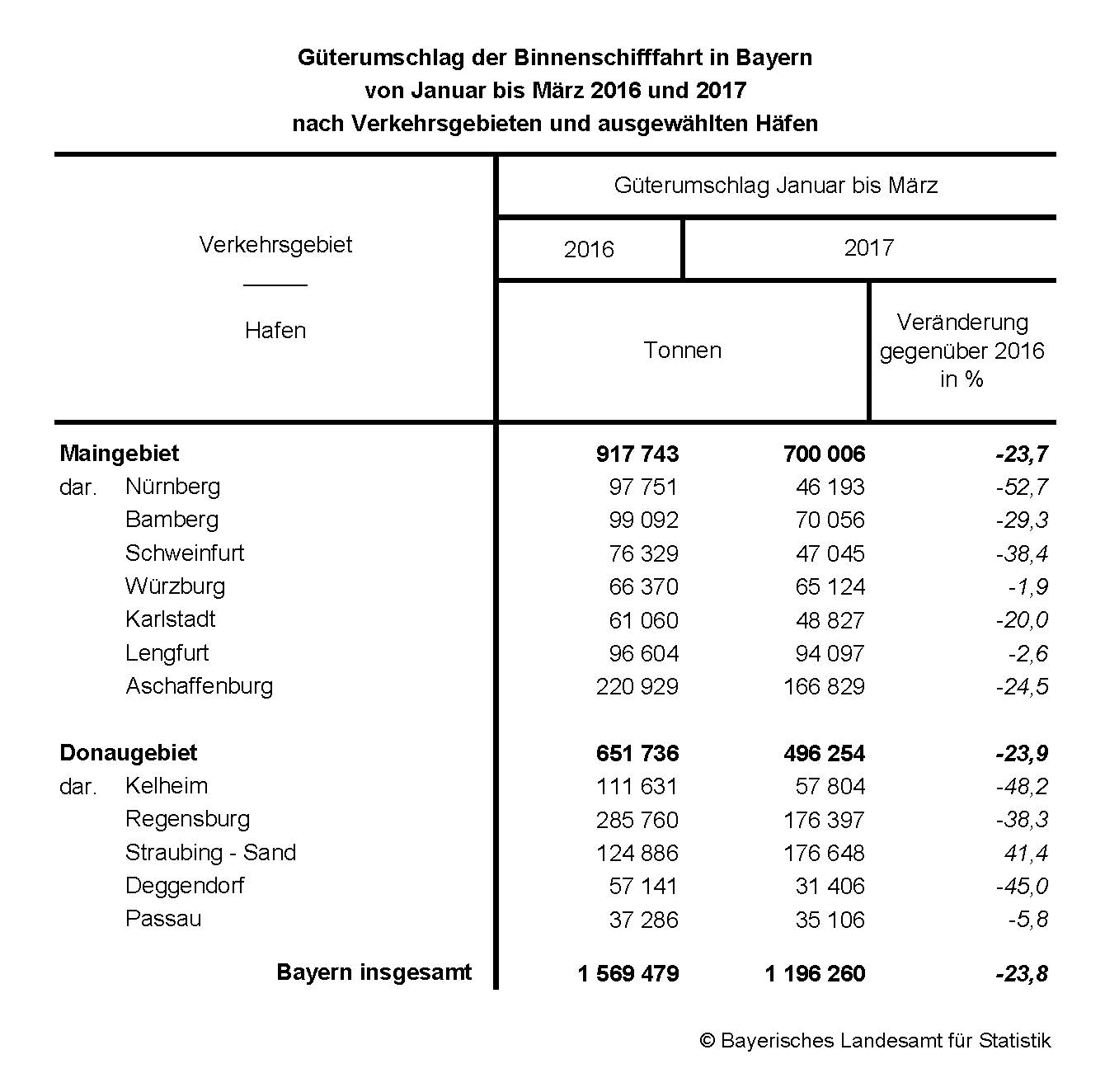 Der Güterumschlag an der Donau ging im ersten Quartal 2017 um 23,9 Prozent auf rund 0,5 Millionen Tonnen zurück, in den Mainhäfen sank er um 23,7 Prozent. Die umschlagstärksten Häfen waren Straubing-Sand und Regensburg mit jeweils knapp 180 000 Tonnen. Insgesamt meldeten sich 1 420 Schiffe mit Umschlagsgütern an und ab, davon befuhren mit 52,4 Prozent etwas mehr als die Hälfte der Schiffe (744) den Main.