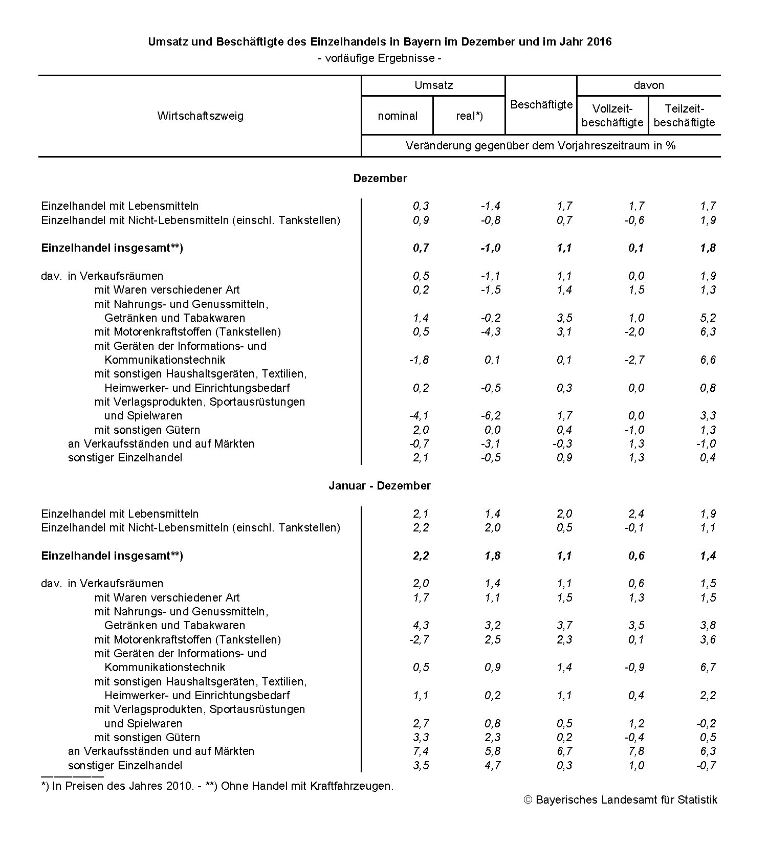Nach den im Bayerischen Landesamt für Statistik vorliegenden ersten Ergebnissen der Monatsstatistik im Einzelhandel stieg der Umsatz im bayerischen Einzelhandel im Jahr 2016 im Vergleich zum Vorjahr nominal um 2,2 Prozent und real um 1,8 Prozent. Die Zahl der Beschäftigten erhöhte sich um 1,1 Prozent. – Im Dezember 2016 wuchs der nominale Umsatz des bayerischen Einzelhandels gegenüber dem Vorjahresmonat um 0,7 Prozent, der preisberei-nigte Umsatz ging allerdings um 1,0 Prozent zurück. Die Zahl der Beschäftigten nahm um 1,1 Prozent zu.