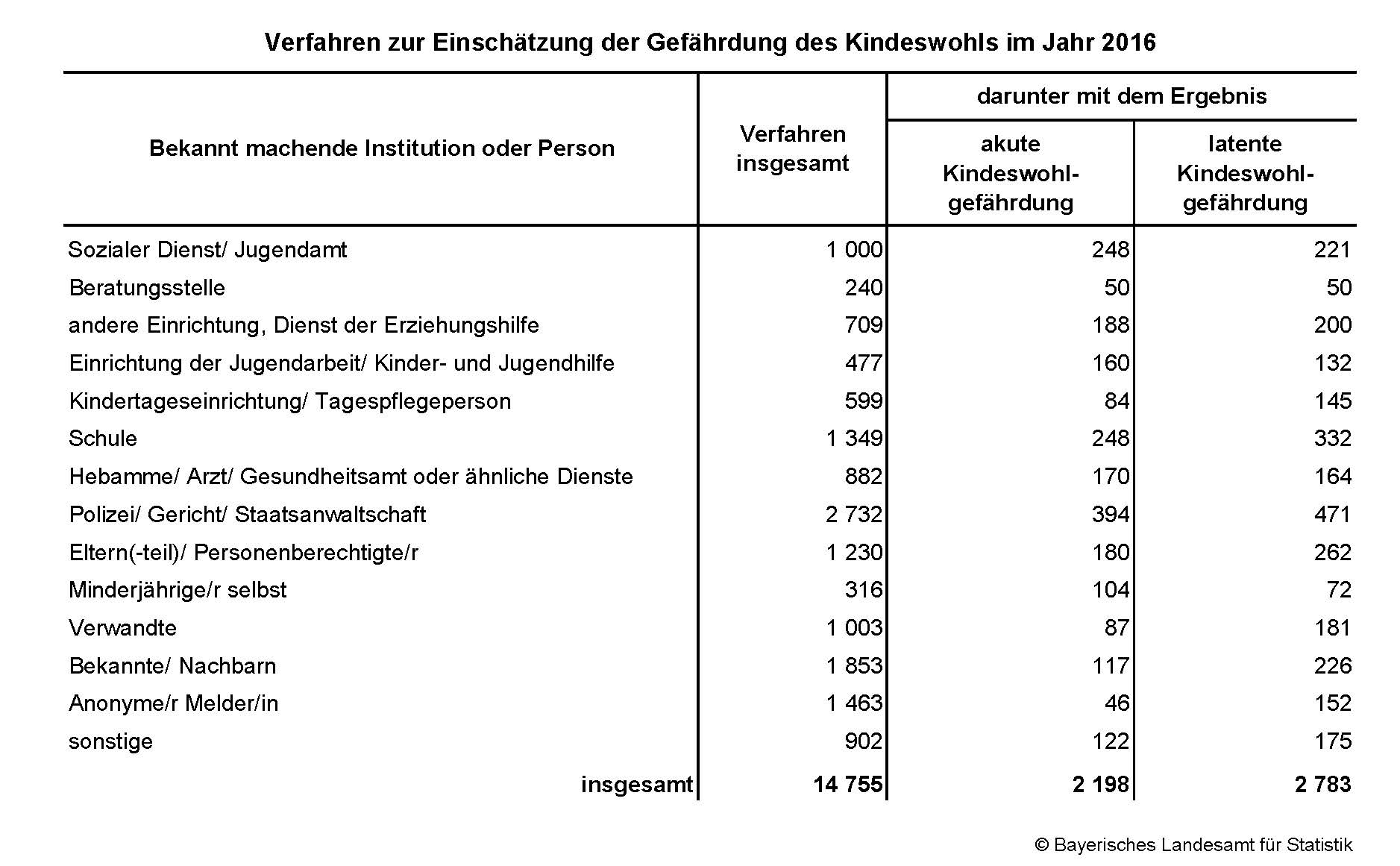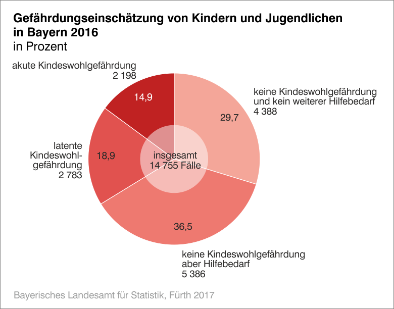 Die Bayerischen Jugendämter meldeten im Jahr 2016 insgesamt 14 755 Gefährdungseinschätzungen, das heißt Fälle, in denen geprüft wurde, ob das Wohl von Kindern bzw. Jugendlichen in Gefahr war. Nach Angaben des Bayerischen Landesamts für Statistik lag in 2 198 Fällen eine akute und in 2 783 eine latente Kindeswohlgefährdung vor. Bei 5 386 Gefährdungseinschätzungen wurde keine Kindeswohlgefährdung festgestellt, jedoch Hilfebedarf und in 4 388 Fällen wurde weder eine Kindeswohlgefährdung noch weiterer Hilfebedarf ermittelt.