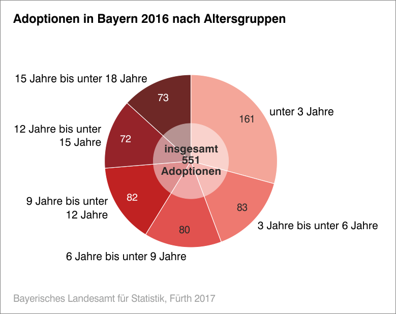 Im Jahr 2016 wurden nach Angaben des Bayerischen Landesamts für Statistik insgesamt 551 Minderjährige adoptiert. Gegenüber 2015 mit 535 durchgeführten Adoptionen bedeutet dies ein Plus von drei Prozent.