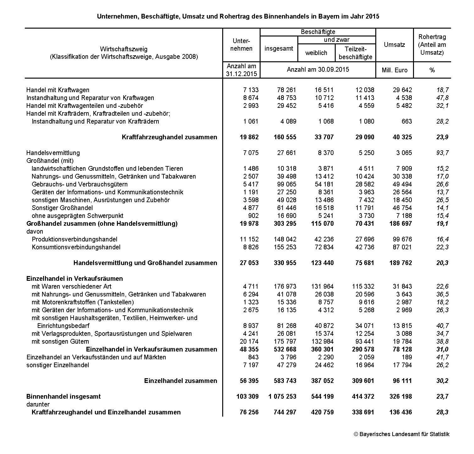 Die bayerischen Händler erwirtschafteten im Jahr 2015 einen Umsatz von über 326 Milliarden Euro (+19 Milliarden Euro gegenüber der Erhebung 2014), davon gut 96 Milliarden Euro im Einzelhandel, fast 190 Milliarden Euro im Großhandel und gut 40 Milliarden Euro im Kraftfahrzeughandel.